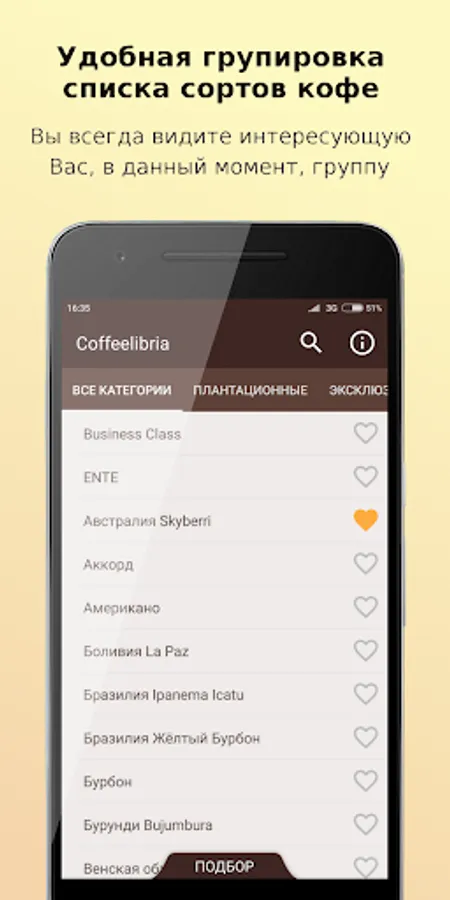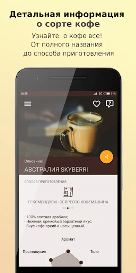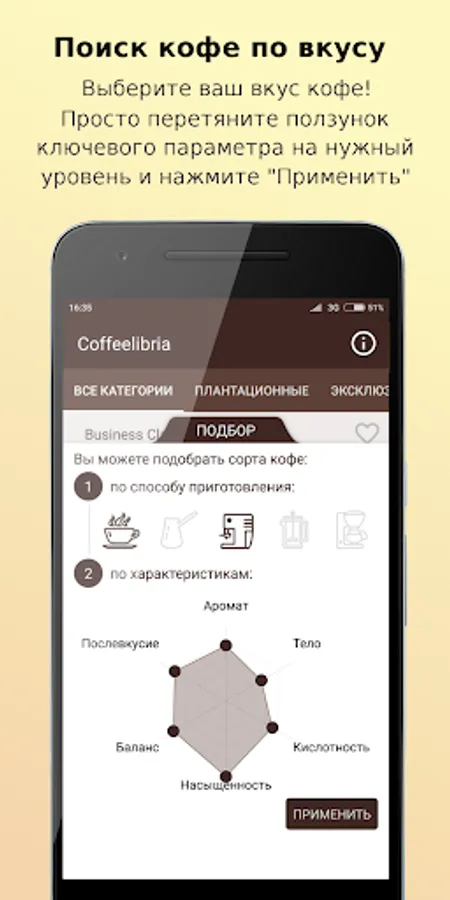 The application is very easy to use and has an attractive design. How does it work? You can easily find what you need, just by installing features such as aroma, body, acidity, richness, balance and finish on your preferred level and Coffeelibria tell you what kind of coffee meets these parameters. Here you can read detailed information on the place of cultivation, to obtain detailed recommendations on how to prepare and display an accurate description of the taste of coffee. Our application gives you a complete picture of the product, which you are invited. With it, you will learn about all the coffee!