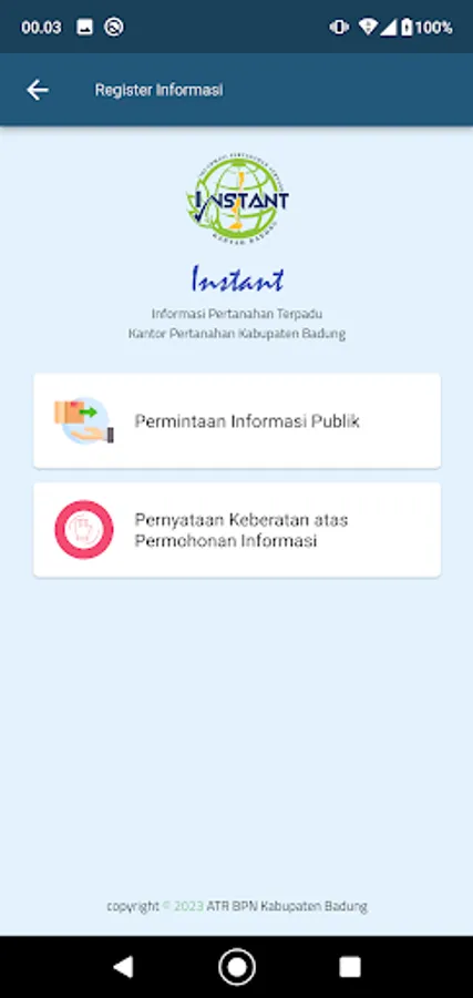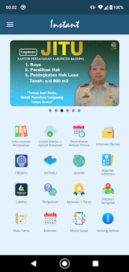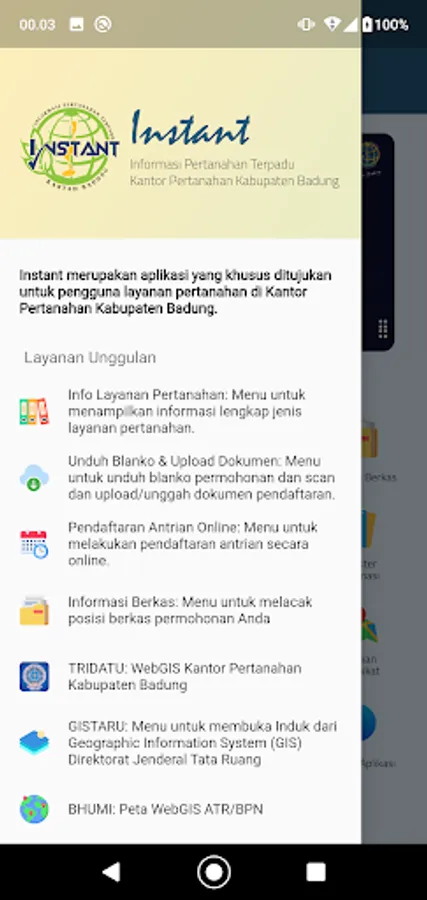 INSTANT or Kantah Badung Integrated Land Information, previously known as the SIBadung application, is the official application of the Badung Regency Land Office, which makes it easy for the public to access land information and services without face to face.