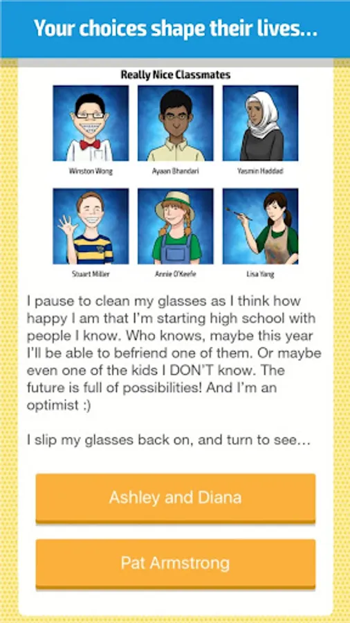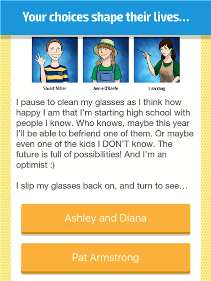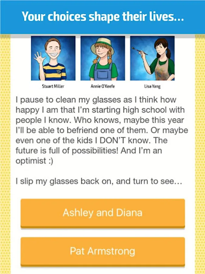 All stories start at the same point: Home Room in Ms. Hawkins class. From there the character's journey in high school will begin and it's up to you with the choices they make.