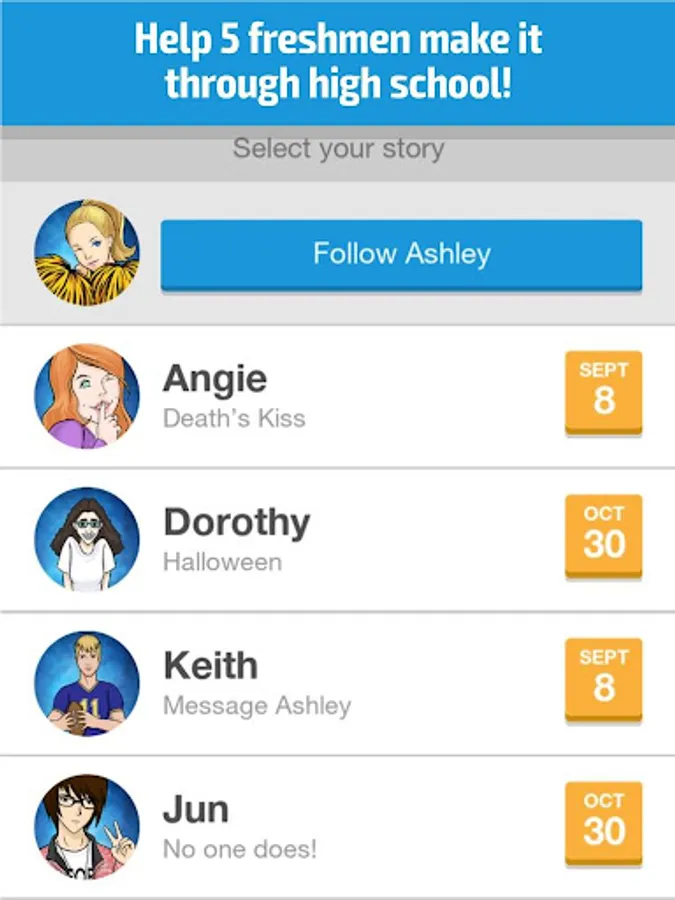 Ashley, Angie, Dorothy, Keith and Jun are all ready to begin freshman year of high school with you. What character do you want to experience high school through? Ashley, the confident cheerleader, Angie, the gossip girl, Dorothy, the nervous outcast, Keith, the star quarterback or Jun, the asian immigrant.