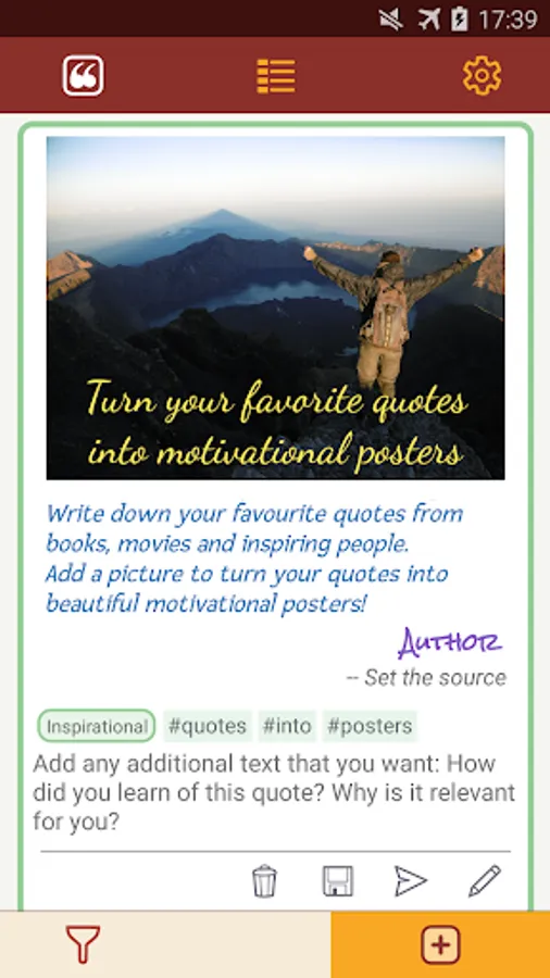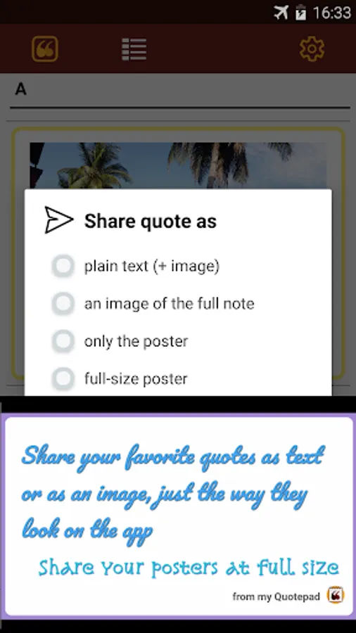 • share your inspiring quotes with your friends, as plain text or as a copy of how they look on the app