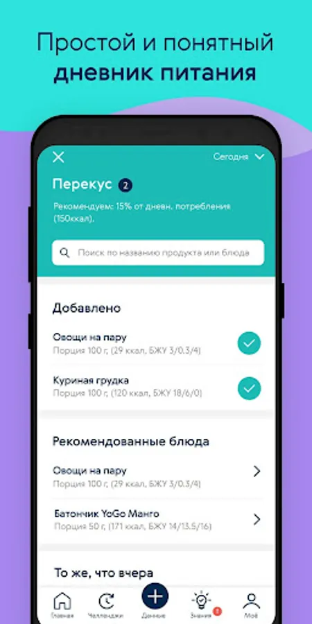 Like it or not, but it is necessary to “register” one’s own food (although sometimes it’s too lazy, we understand). We tried to make your life as easy as possible - we made a simple and understandable Food Diary. Just skip - just count.