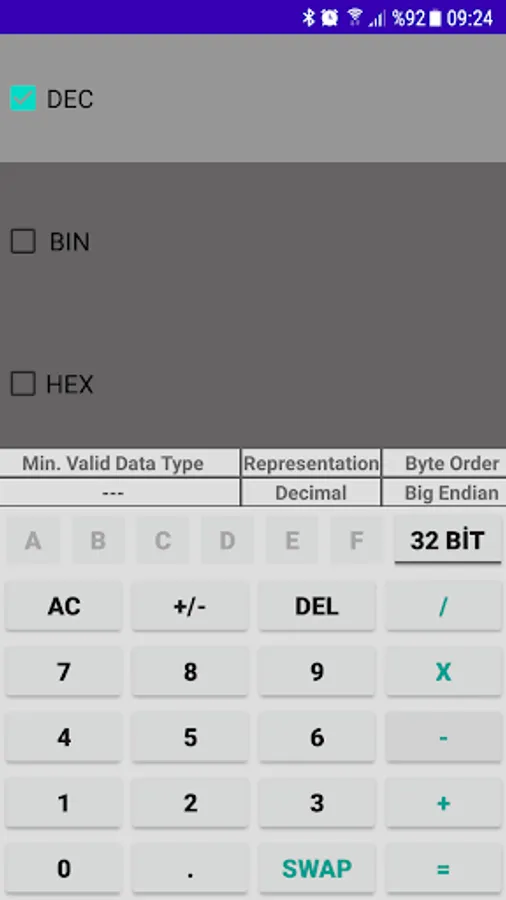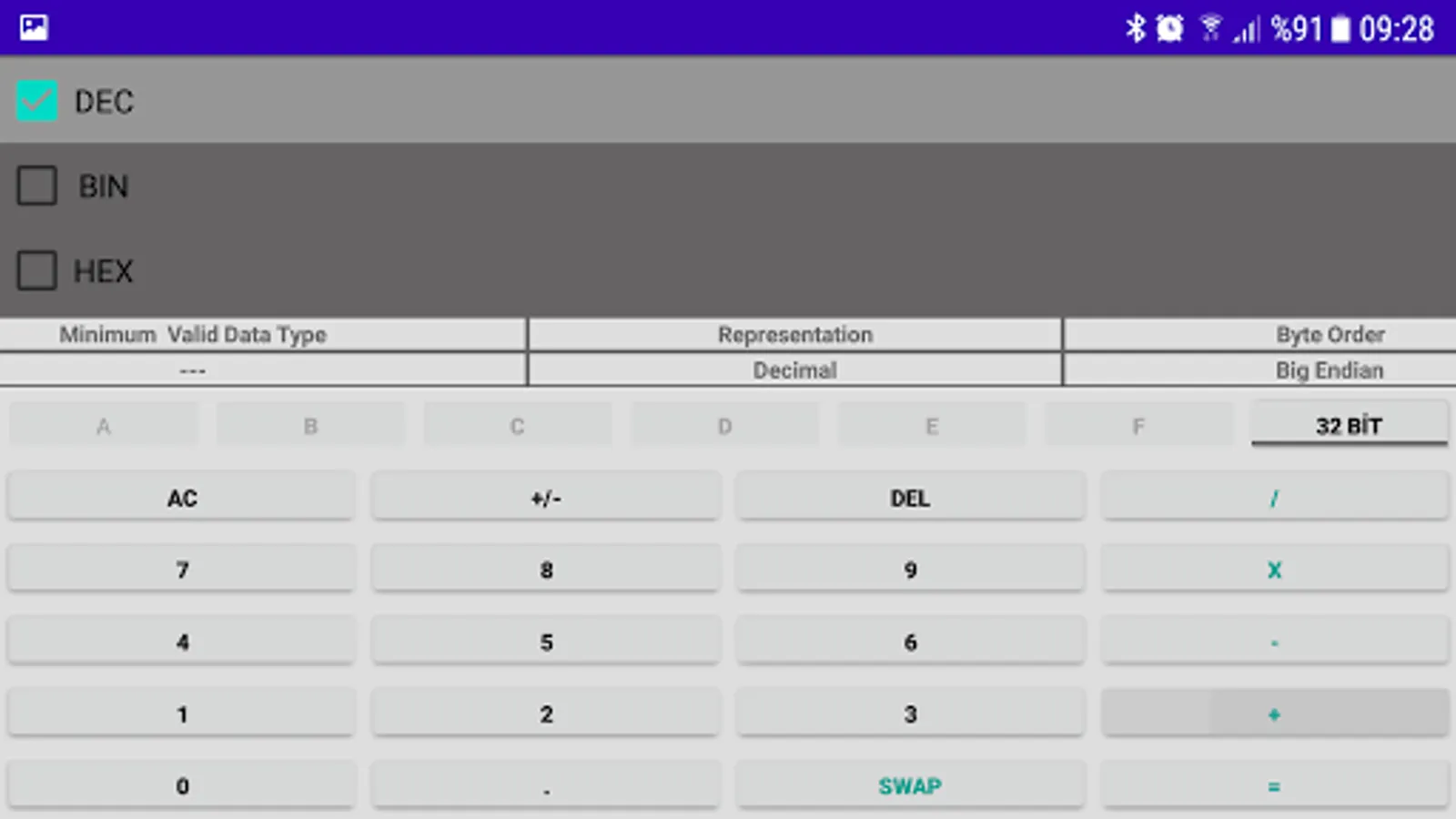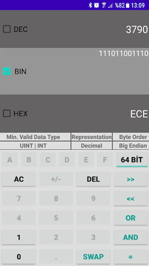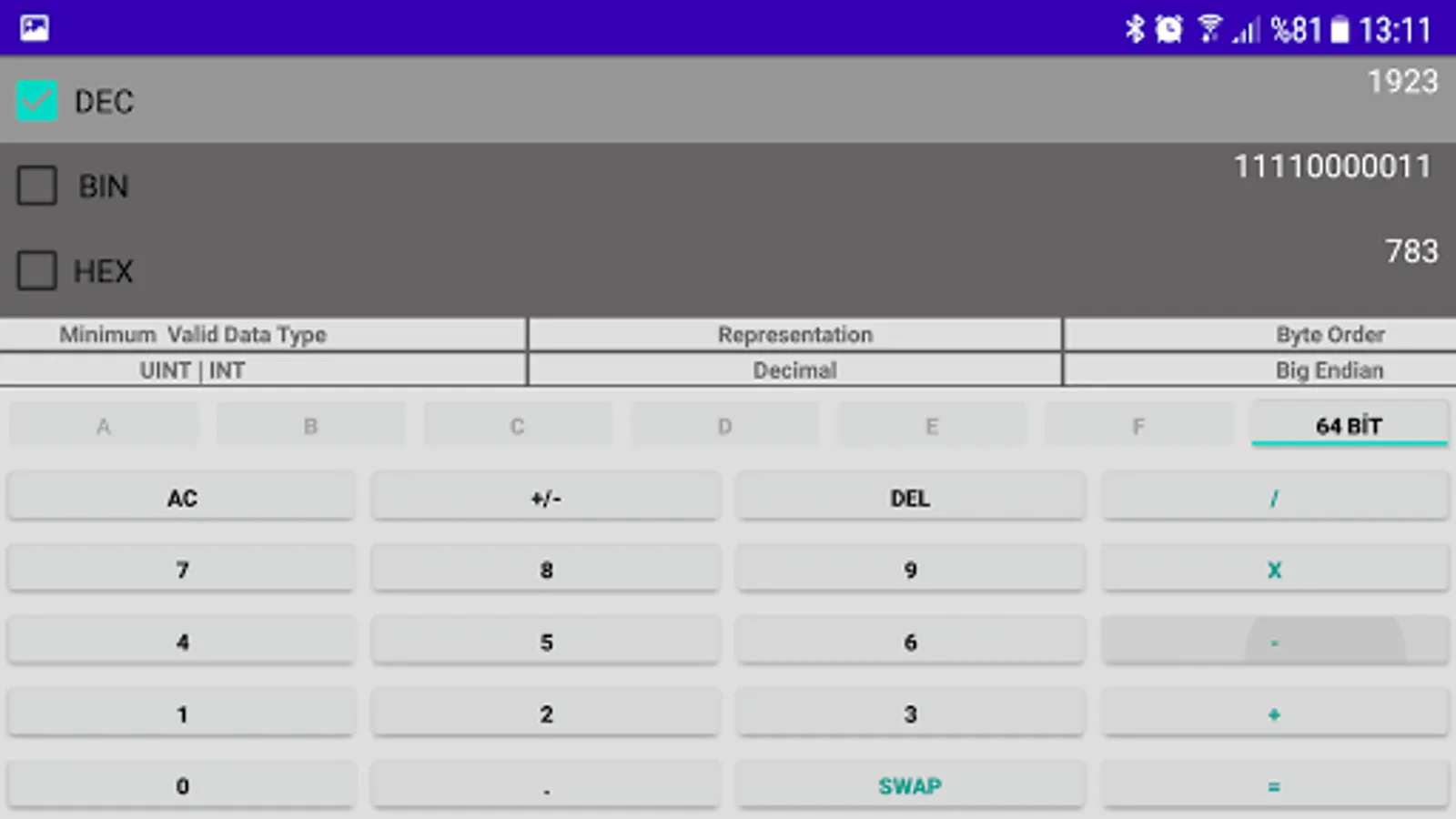 It shows DEC, BIN and HEX values together and you can use any of them to enter values.