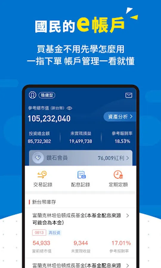 買基金不用先學介面怎麼用,國民e帳戶APP一指就能下單,帳戶管理一目瞭然。