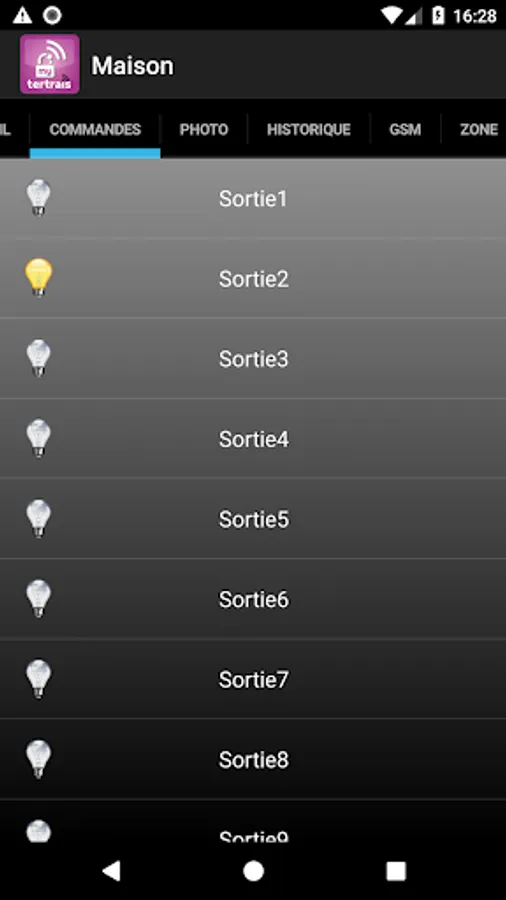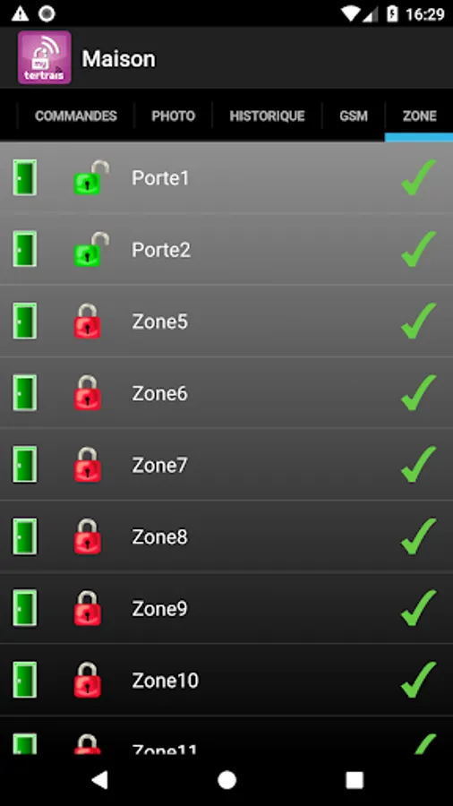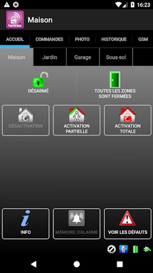 - Display of the status of the zones of the system with the possibility of activating / deactivating them;
