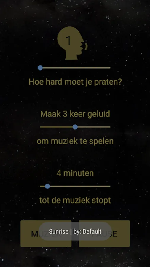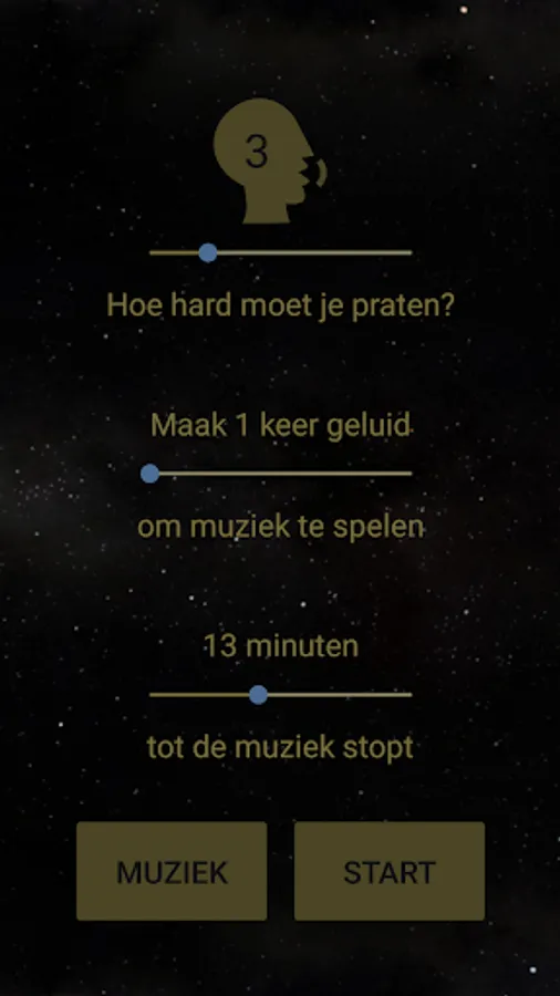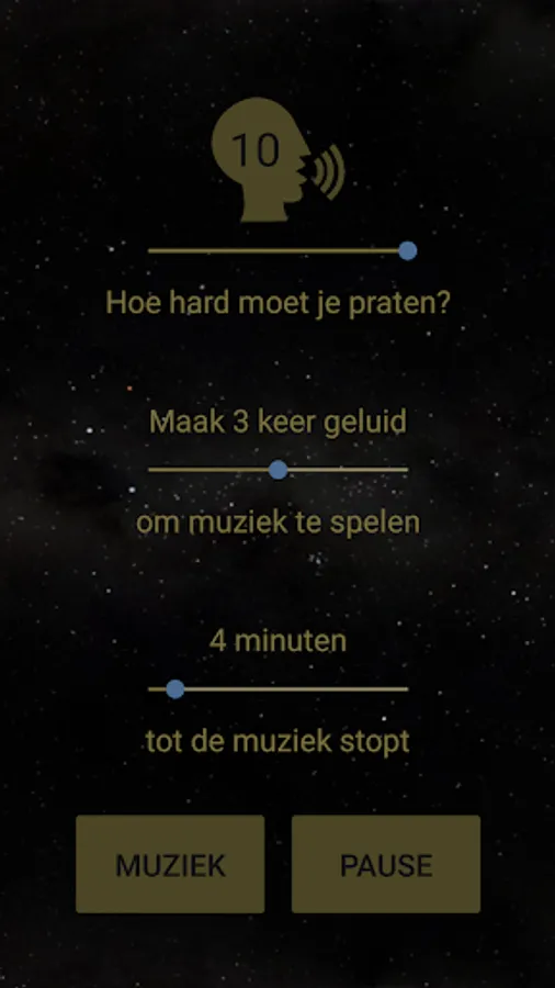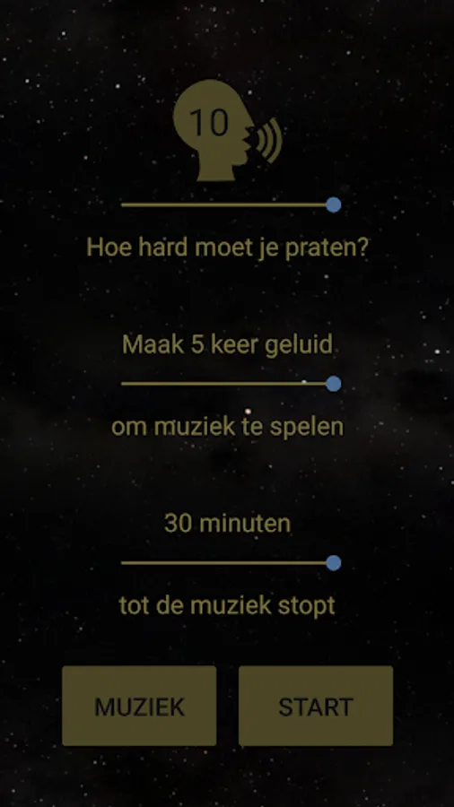 The app plays music when you make a noise - for example when you call or talk. You can set how loud you should call, how often you have to call and how long the music will play. The dark colors and star background ensure that the app does not wake you up extra at night and can get you back to sleep. If the screen turns black, the app will continue to listen in the background. The app is not connected to the internet and no data from clients is passed on or saved.