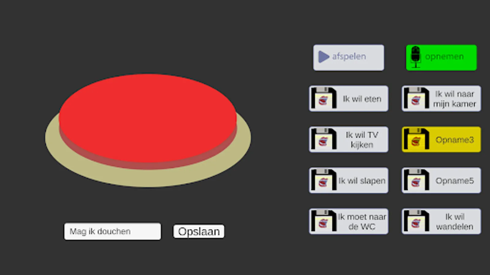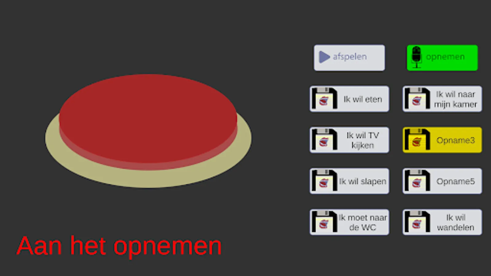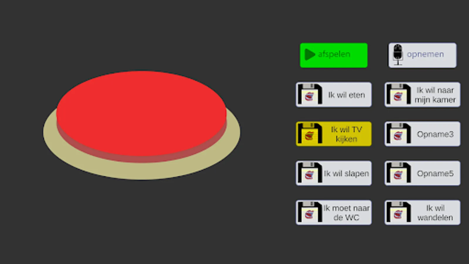 You can use this app to record and play back speech in a way that is simple and recognizable for many people in the care for the disabled, namely with a big red button.
