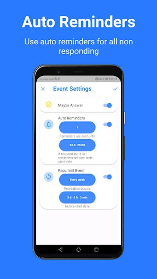 With automatic reminders, you'll never have to remind friends to respond to appointment requests again. Just set how often you want to remind people who haven't responded to your event, and Meet My Mates will do it for you.
