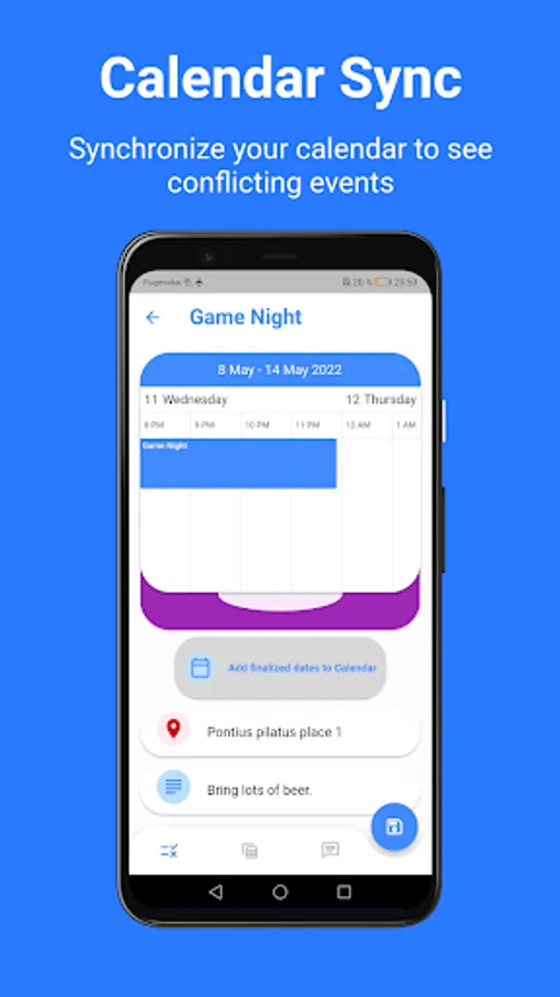 Sync your calendars to see directly in the app if you already have a calendar event on the suggested dates. You can also add finalized events directly to your calendar with one click.