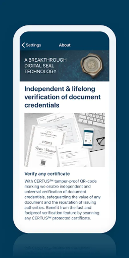 CERTUS sets a new standard in securing value documents, credentials and qualifications. It combines breakthrough digital seal technologies protected by the blockchain with a secure QR-code applied to your documents.