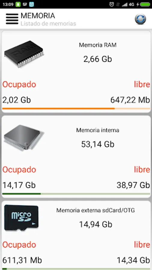 With this application you can quickly view the size and occupancy status of all your phone's memory: RAM, system, internal, sdcard, OTG ...