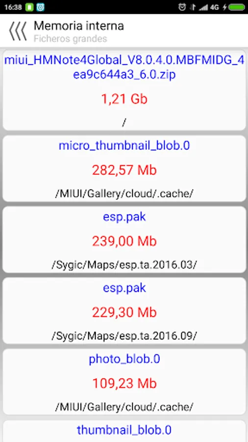 Besides clicking on each memory you can do quick searches of large files to free up space in a jiffy. They will be ordered by size from largest to smallest. A click on a file opens it, and a long press on a file allows you to delete it.
