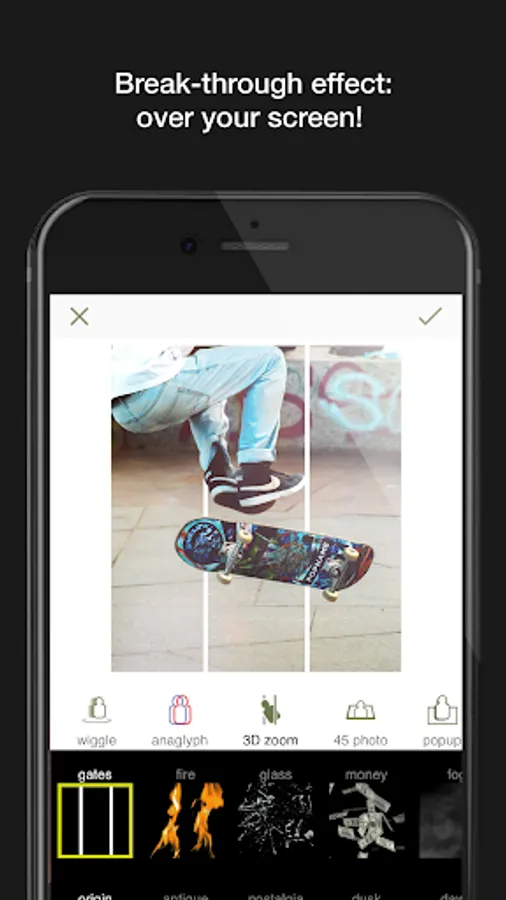 Seven AR effects are embedded inside the break-through effect (Flame, Glass, Fog, Blizzard, Ray, etc.). These can help you to make the coolest moving photo!