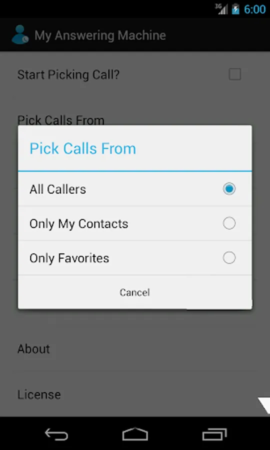You can customize the calls which Answering Machine can pick for you. You can set All Calls/Pick calls only from callers which are in your contact list/Pick call from callers which are your favorite contacts.