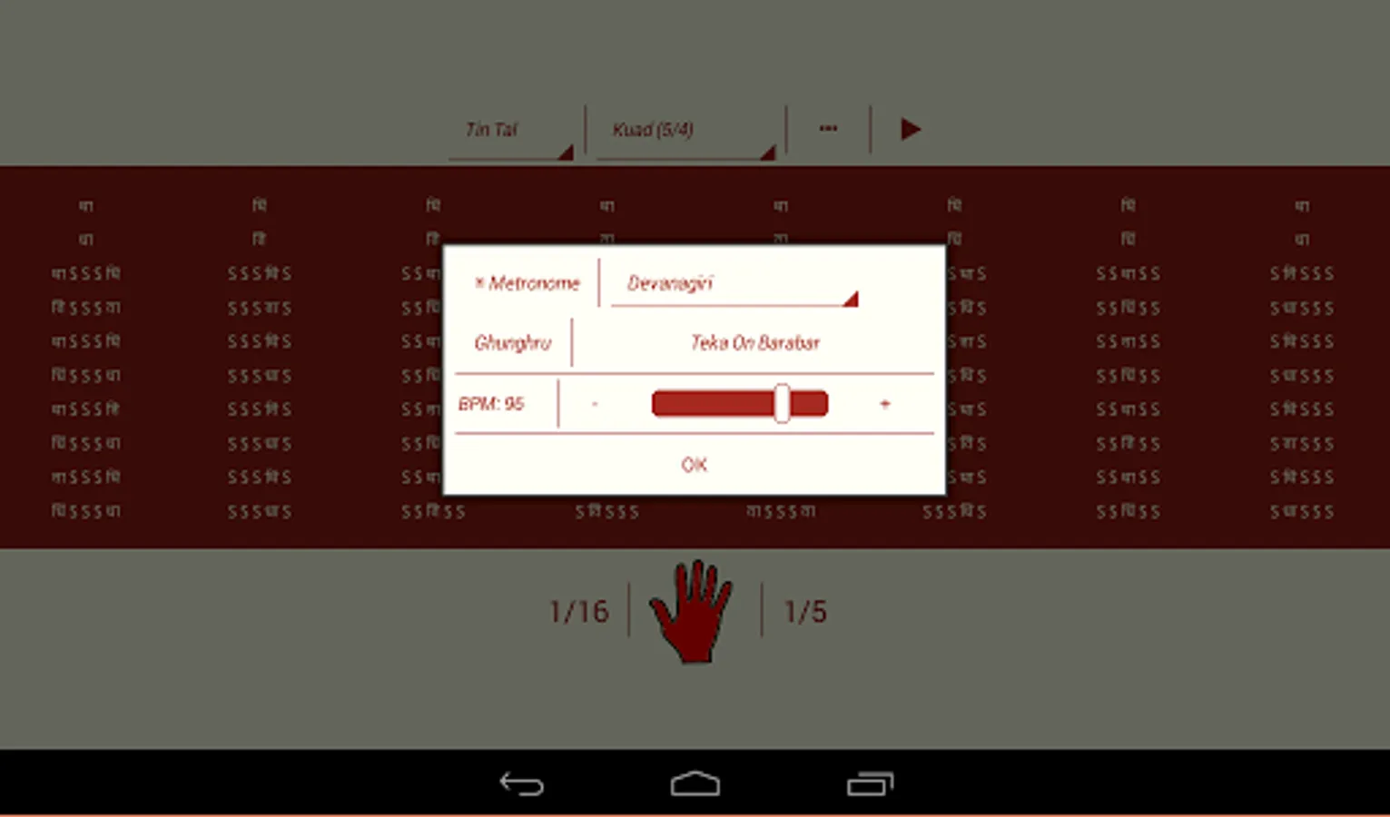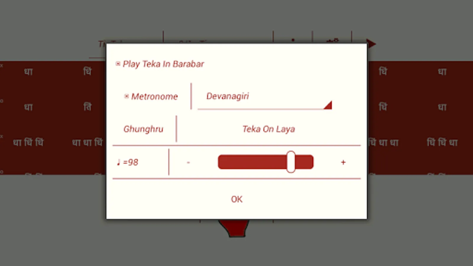 ★ Optional mode with teka on barabar and metronome in selected laya (Useful for kathak/dance practice)