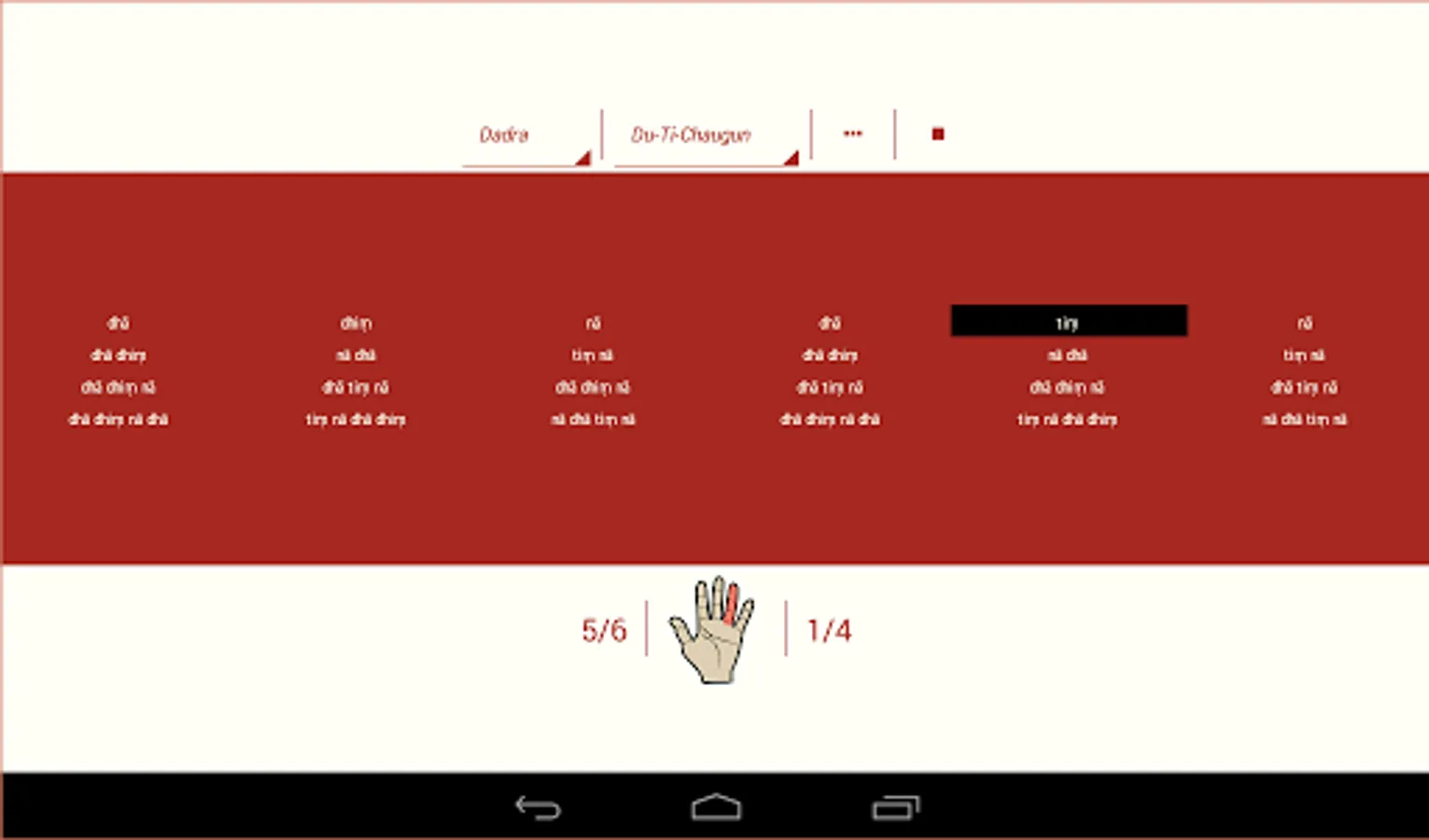 Laya Tarang (rhythmic waves) is a Hindustani music related app intended for the practice of Layakari (Polyrhythm) under basic hindustani taals. Layakari means the play of rhythm i.e., the simultaneous playing of two different rhythms. It is similar to the Polyrhythm in western music. With LayaTarang, learners of hindustani music ( tabla, vocal and instrumental ) and dance ( kathak) can sharpen their Layakari skills. The app provides an ability to play 5 basic tabla taal in 8 different layakari and their combinations. Optional mode with tabla teka on 'barabar' and metronome in selected 'laya' is useful for kathak dance practice and Hindustani vocal or instrumental music practice. The visual hand and finger indication helps in practice of reciting 'teka' in different layakari while mainting the 'tala' with hand. The tabla bols are displayed in devanagiri or english script in the form useful to learn writing taals in the Pt. Paluskar and Pt. Bhatkhande notation systems.