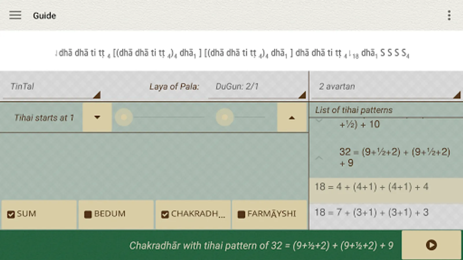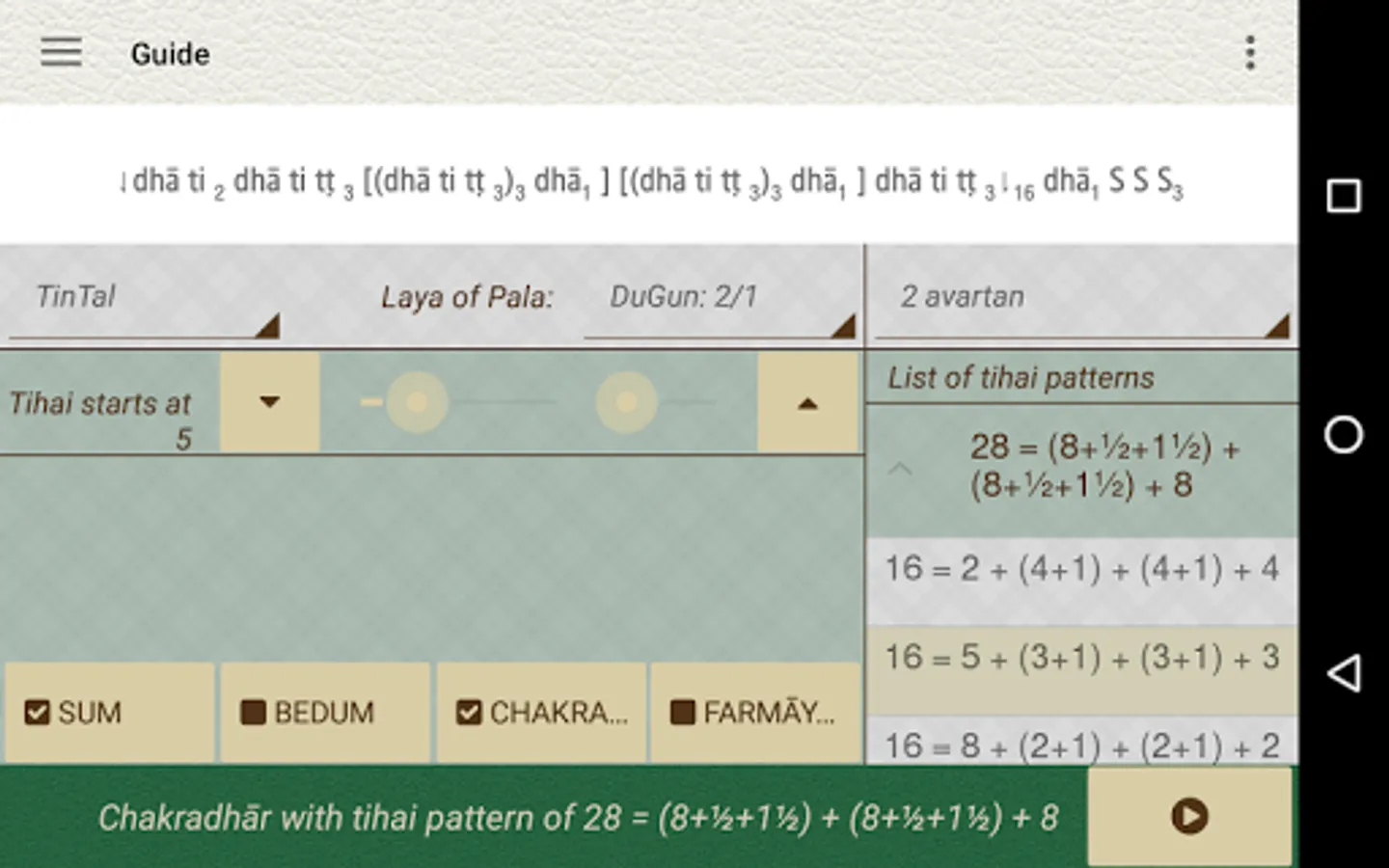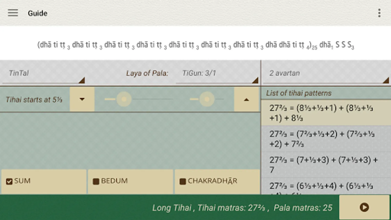 ★ Guide Mode - To guide the choice of tihai to start from any matra of a given taal