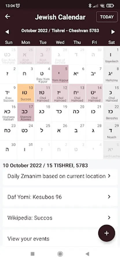A Hebrew calendar - including the times of the day, the Daf Yomi, and the events of that day.