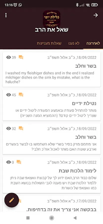 Ask the rabbi - option to send questions to the rabbi.