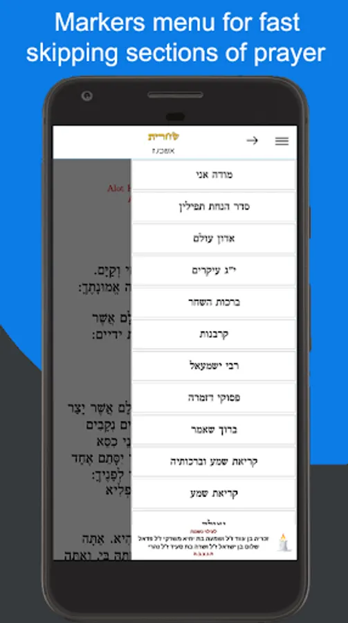 - Text size - Change the text's size by pinch or extend your fingers over the prayer's screen.