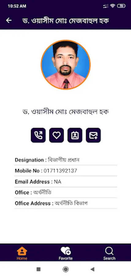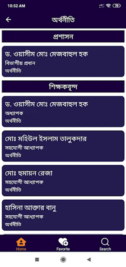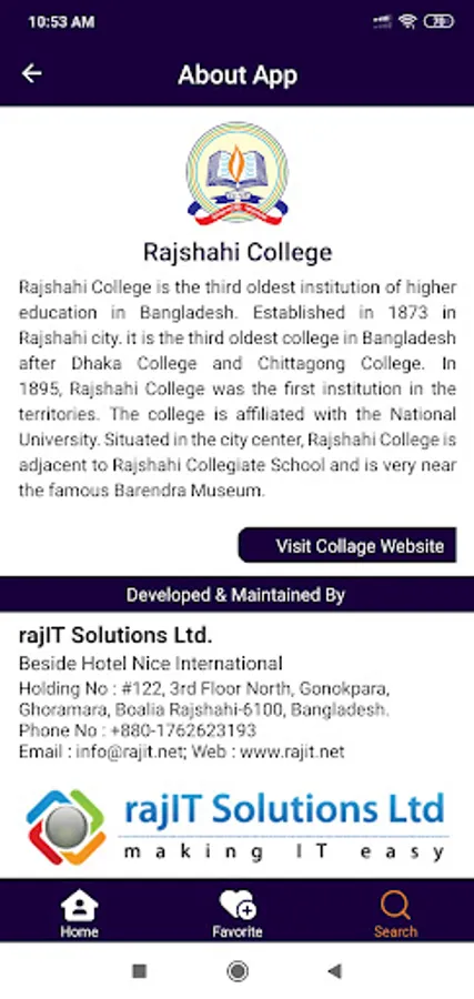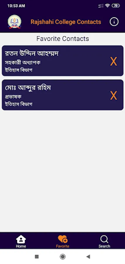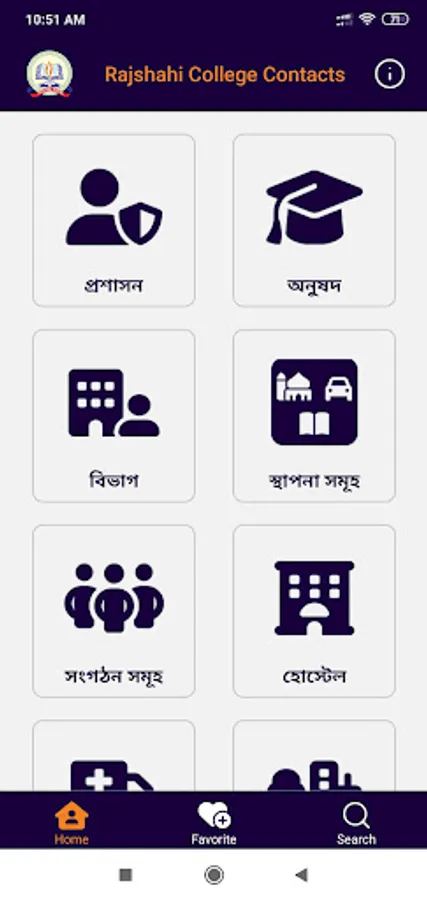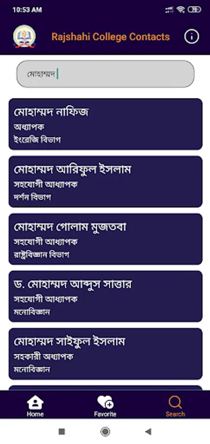 The Rajshahi College Contacts app contains teachers, officers, and other staff's phone numbers and email addresses. Anyone can find a person's contacts by searching or navigating through the listings and can call, text, or save his/her numbers to contact directly from this app. If any new or updated information is available, data inside this app will automatically be updated when the phone is connected to the internet.