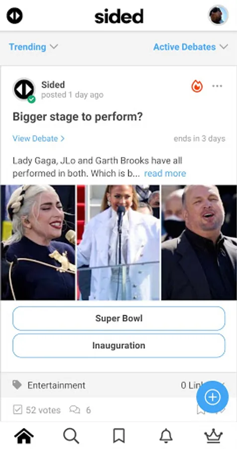Create your free Sided account today to vote and debate the most important topics from sports, gaming, and entertainment, to politics and local news. Each debate is a competition with a winner declared at the end of the debate. Earn points for participating and crafting the best arguments for your side.