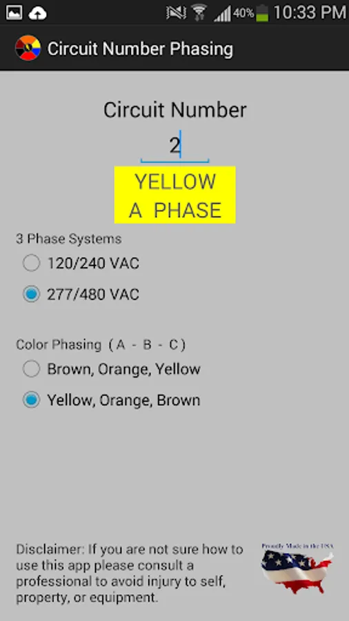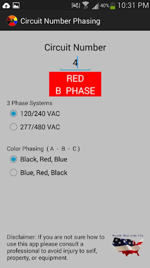 Enter the circuit number, select the voltage of the system and it will show you the color of the phase associated with that circuit number in real-time.