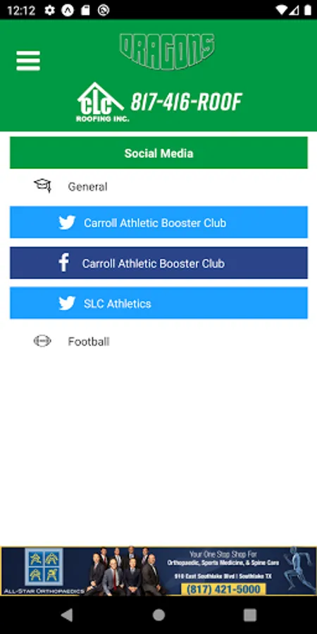 - Supporters: Special Thanks to local boosters and supporters of Southlake Carroll Athletics with a directory including website and in-app calling.