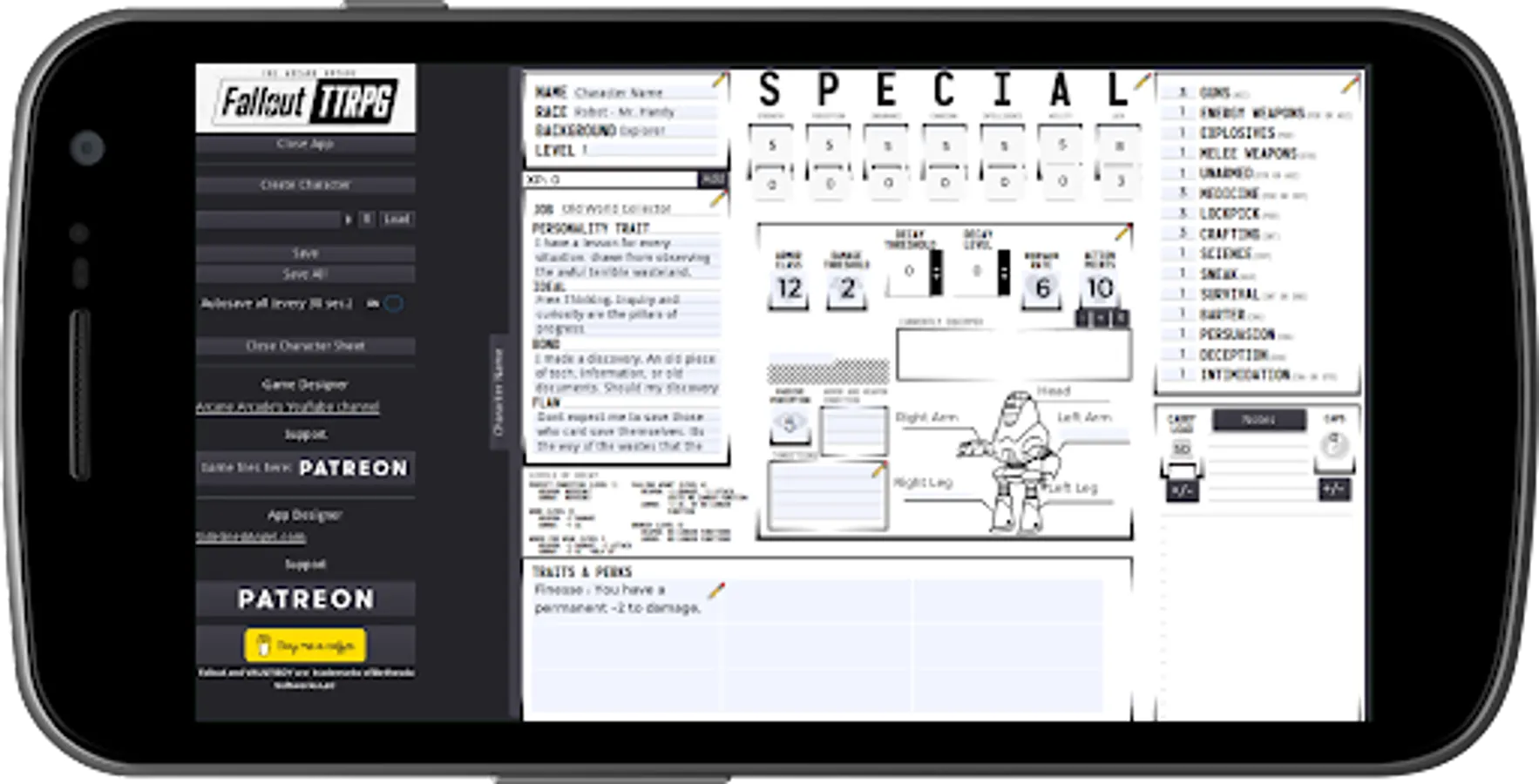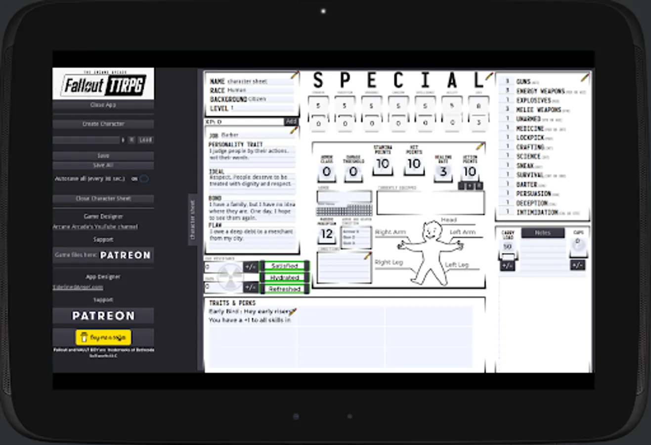 F0:TTRPG is a character sheet editor for a table top RPG inspired by a popular post-apocalyptic game. Play as a human, ghoul, robot, or synth and wander the wasteland with your friends.