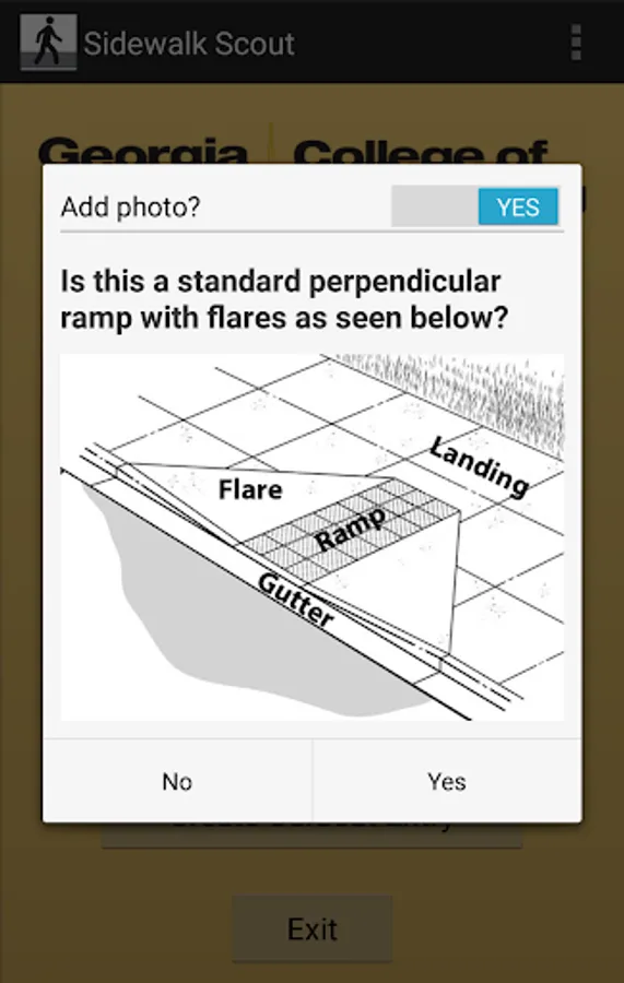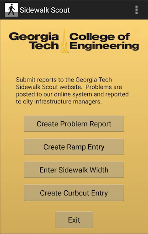 Sidewalk Scout is a crowdsourcing Android app can be used by the public to report problems with sidewalk quality and connectivity. The app allows users to submit a picture of a sidewalk problem (such as a pothole, obstruction, or surface discontinuity) along with the description of the problem. The sidewalk problem location is automatically attached to the report, allowing the server to precisely identify the location of the sidewalk issues for use in community planning. The Sidewalk Scout server is used to create reports of identified problems for the City of Atlanta that can be used for use in sidewalk and ramp repair prioritization. A website interface (http://sidewalkscout.ce.gatech.edu) allows users to view sidewalk problems reported by Atlanta neighborhood