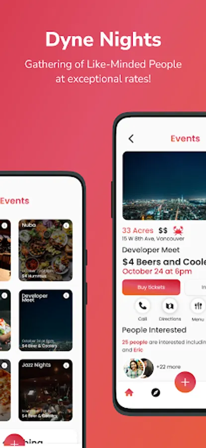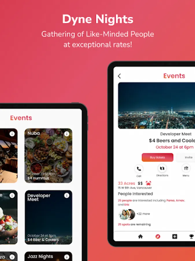 Dyne Nights: our events service for all of Dyne’s partner restaurants! It’s a monthly gathering of like-minded individuals who are passionate about pushing the boundaries of community. Dyne Nights is always an opportunity to meet new people and learn something new, while also getting amazing deals on food. So whether you're a Dyne novice or a seasoned pro, we invite you to come Dyne with us!