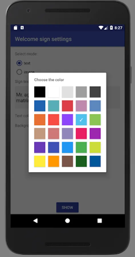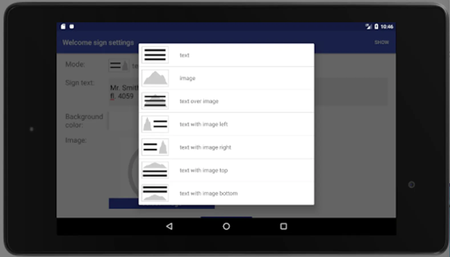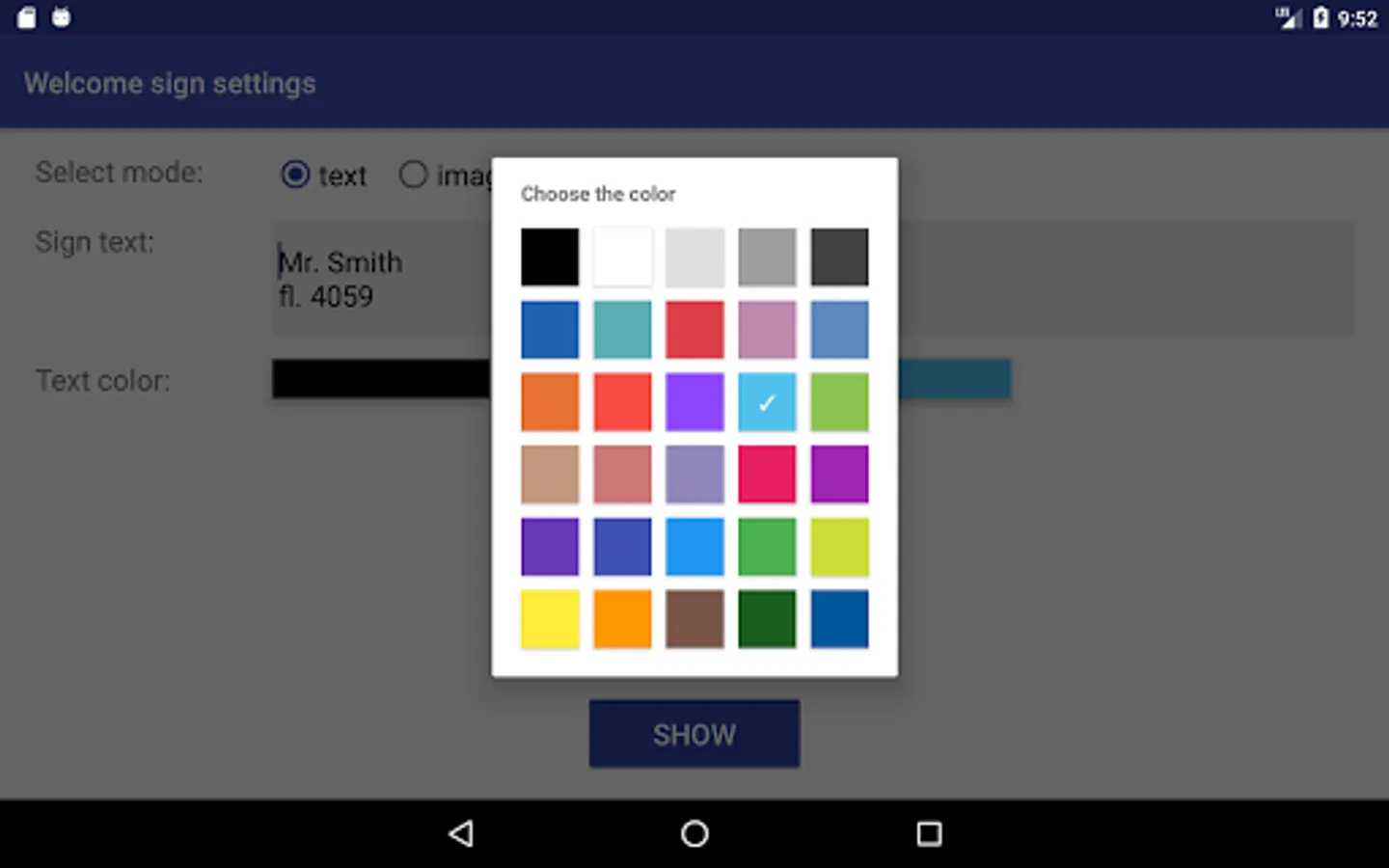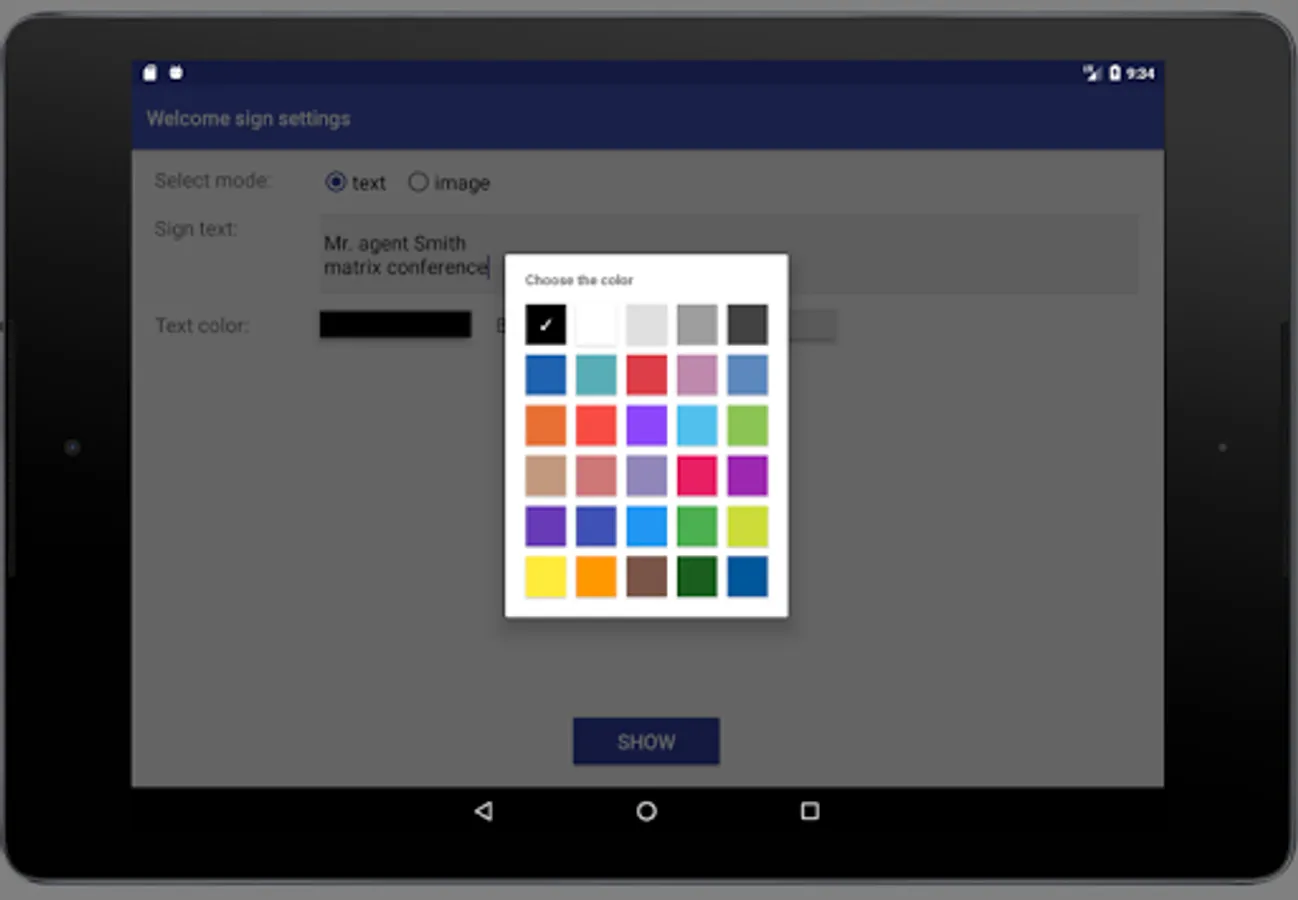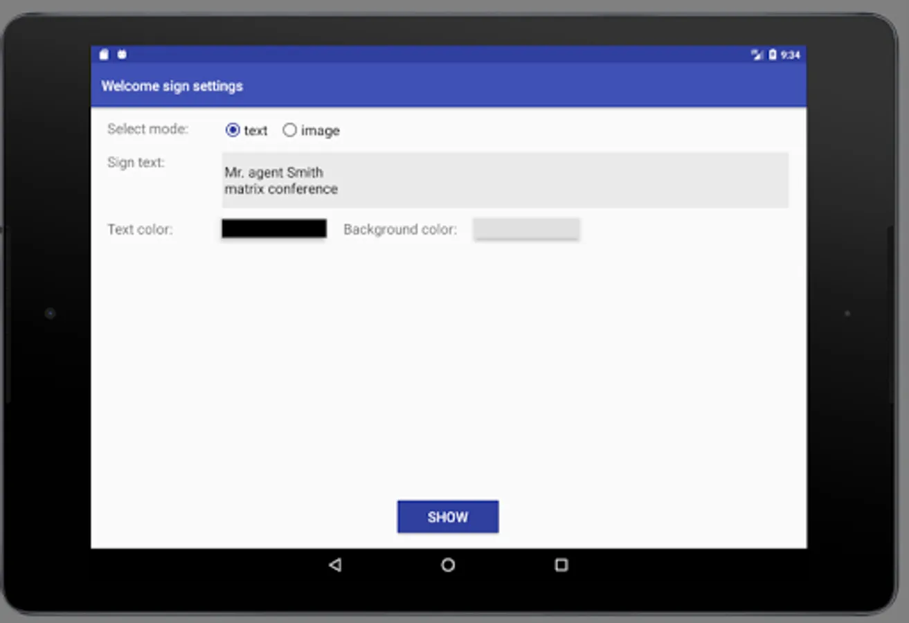 This app turns your tablet or phone into welcome sign (textboard / text banner / signboard) with big text or image. There is no need to print or write by hand paper sign with person name or text, just use this application.