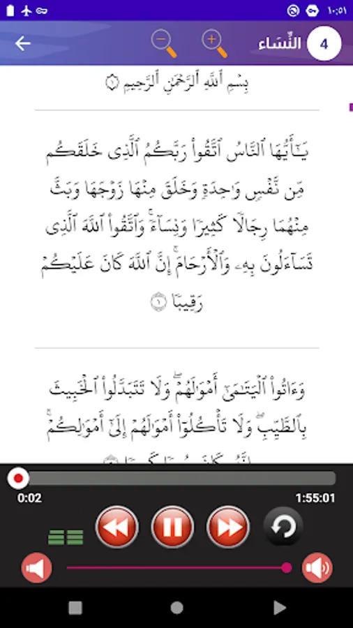The interface of the Holy Qur’an application, recited by Mahmoud Al-Hosary, Hafs recitation, is a simple interface