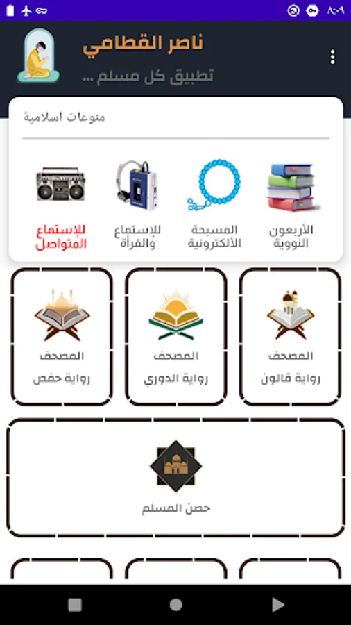 The user needs to download the Nasser Al-Qatami application without the Internet to provide sufficient space on the phone’s internal memory. Nasser Al-Qatami also contains a complete Qur’an without the Internet on the complete Muslim remembrances and also Hisn Al-Muslim without the Net.