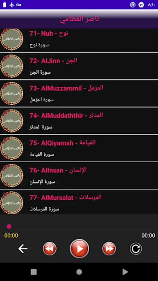 The application of the Holy Qur’an in the voice of Nasser Al Qatami enables you to listen to all surahs of the Holy Qur’an after specifying the name of the surah you want to listen to, which Sheikh Nasser Al Qatami recites in each surah.