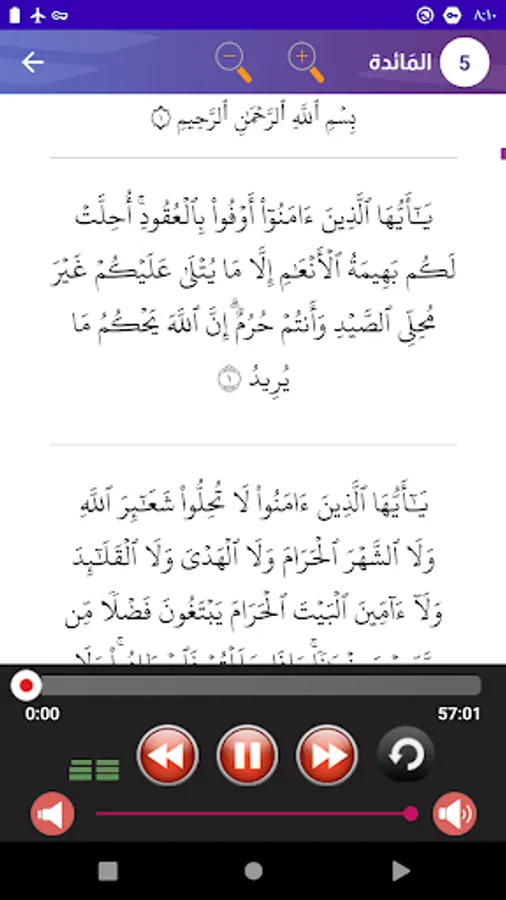 The interface of the Holy Qur’an application, recited by Nasser Al-Qatami, is simple