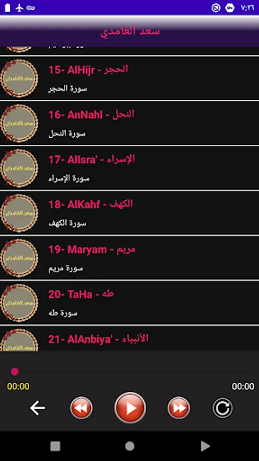 The application of the Holy Qur’an in the voice of Saad Al-Ghamdi enables you to listen to all surahs of the Holy Qur’an after specifying the name of the surah you want to listen to, which Sheikh Saad Al-Ghamdi recites in each surah.