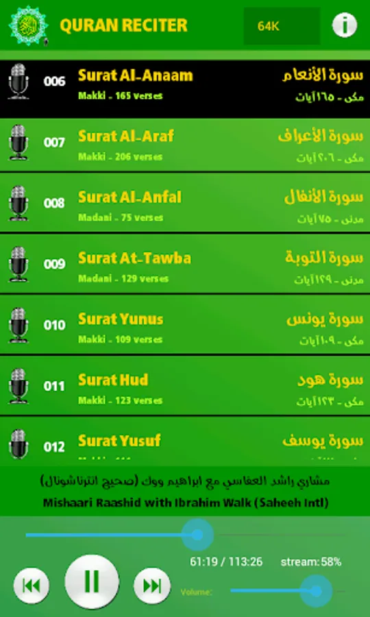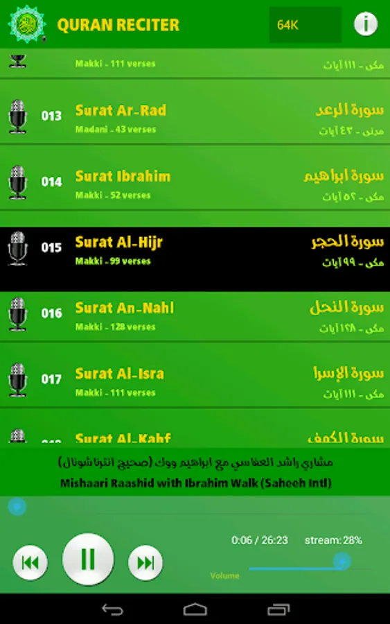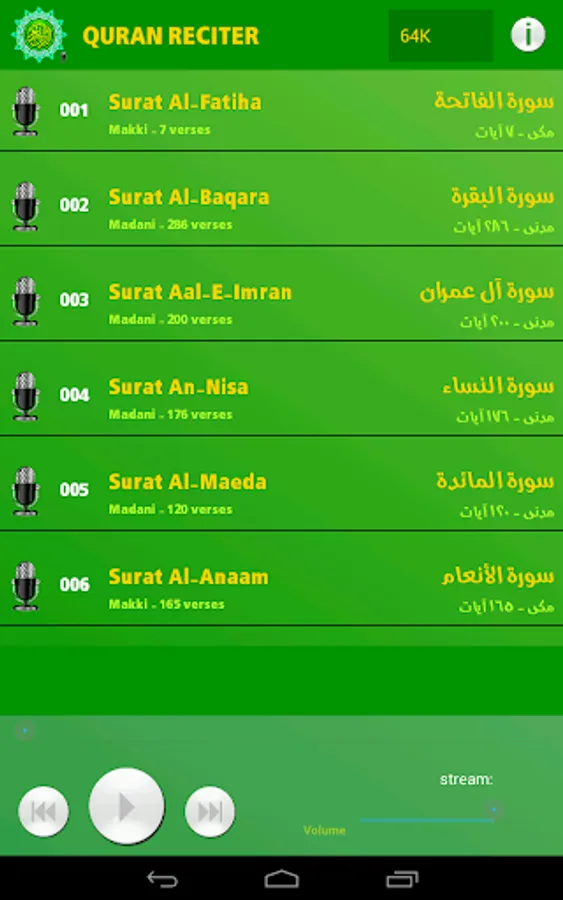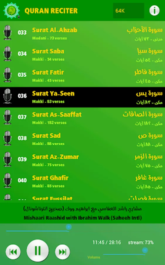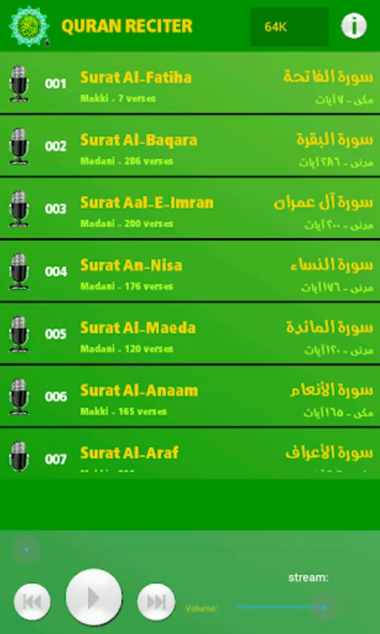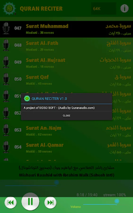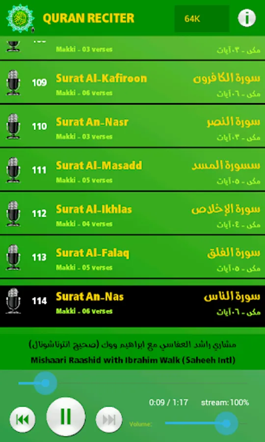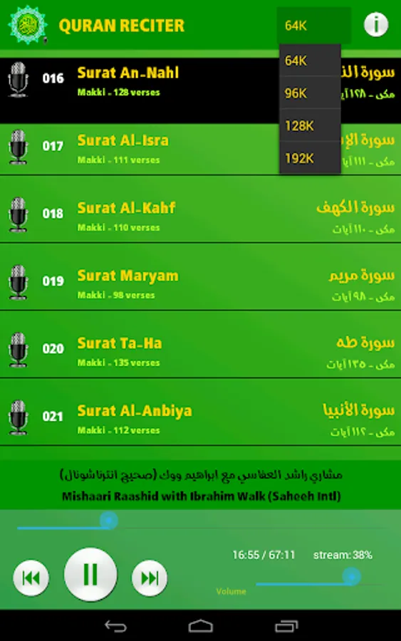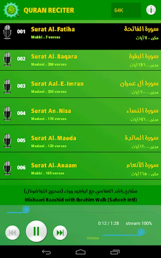 Quran Reciter; streams high quality Quran Recitation with English translation. This application is aimed for everyone; especially for those who doesn't understand Arabic.