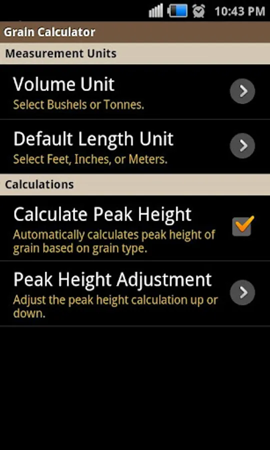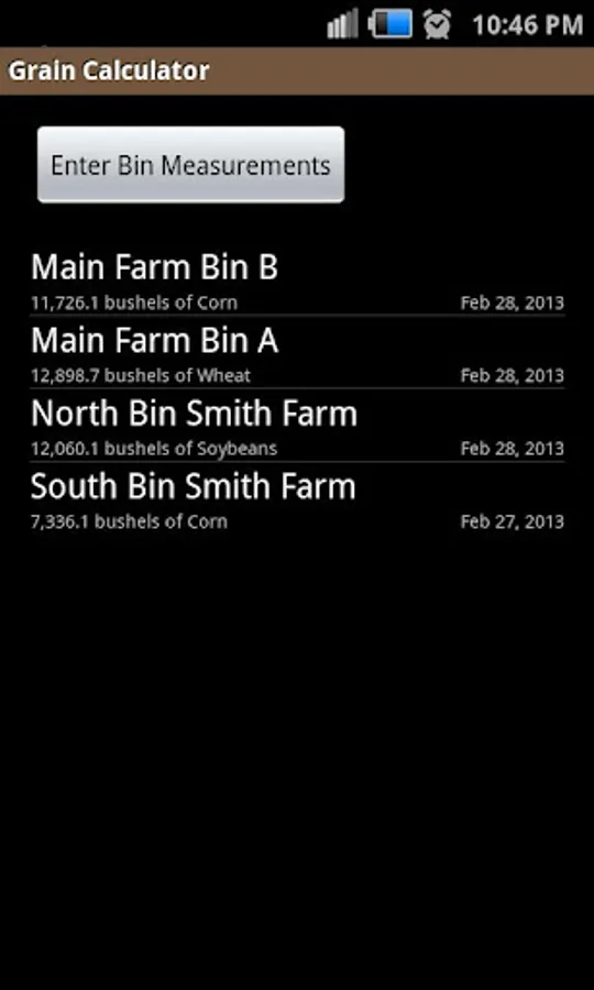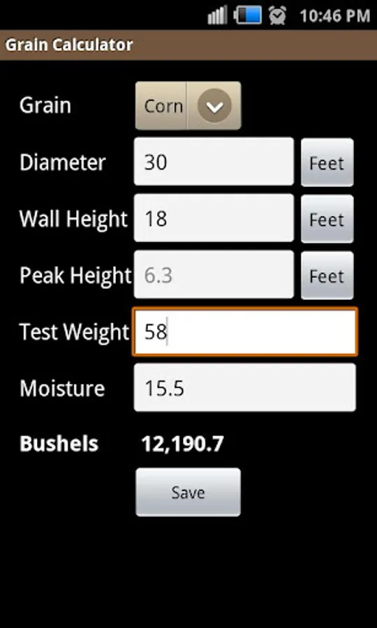 With this application you can easily calculate the amount of grain stored in a round bin. With a minimum of bin diameter and wall height, the application will calculate the number of bushels or tonnes of grain. By default, the grain peak height will automatically calculate and test weight and grain moisture will be set to standard values based on the type of grain. You can adjust any of those factors to produce a more accurate result. You can save the measurements and results to your mobile device for later retrieval.