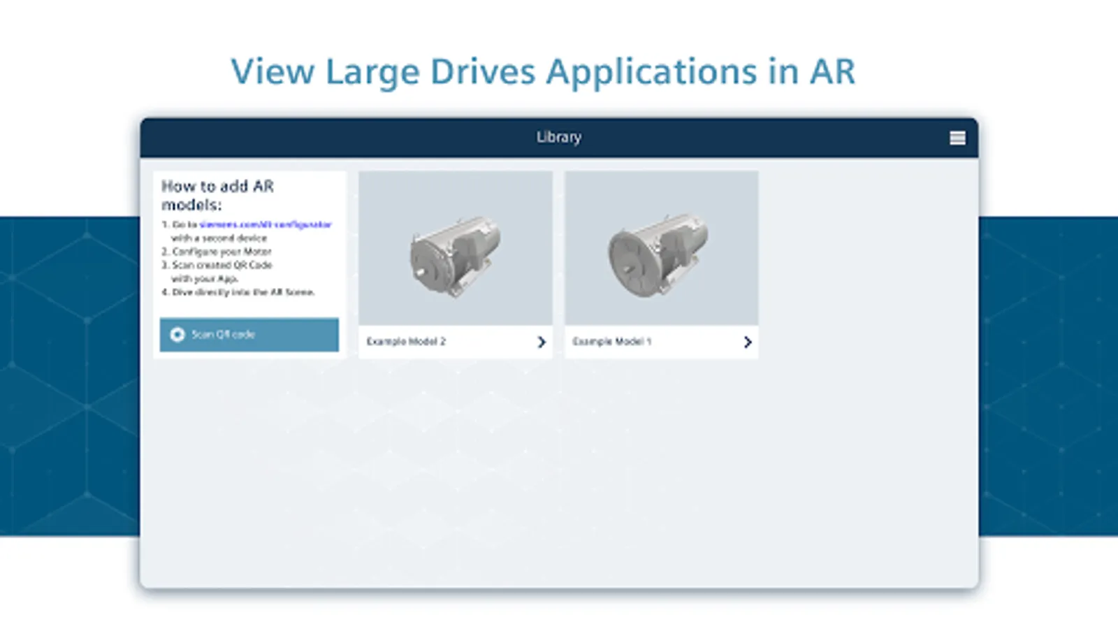 SIDRIVE IQ View is the Augmented Reality App for Large Drives Applications Products. You can configure your motor on www.siemens.com/dt-configurator and scan the QR-Code from the technical data sheet to save the 3D-Model to your Asset Library. Now you can also visualize preconfigured MV Drives. Visualize the product in a real environment and get the impression of dimensions and location connections.
