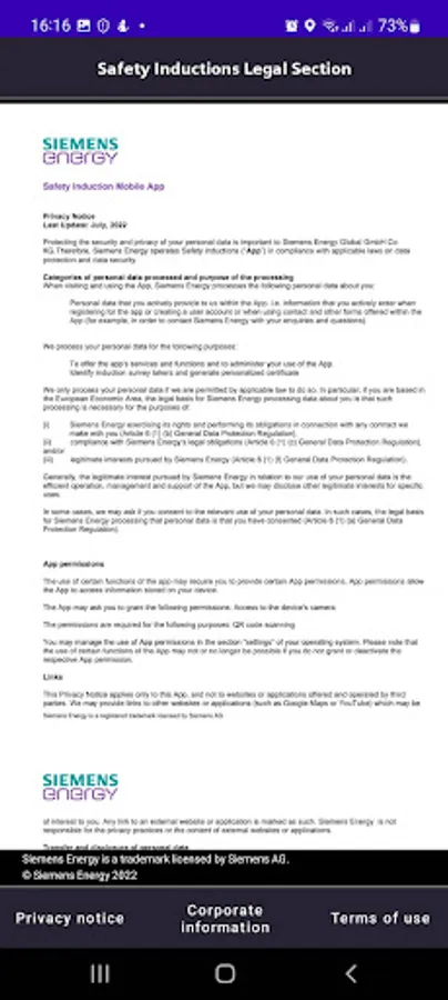 Safety inductions is a mobile application aiming to facilitate and digitize the process of validating the safety induction process for sub-contractors and external service providers on Siemens Energy sites.