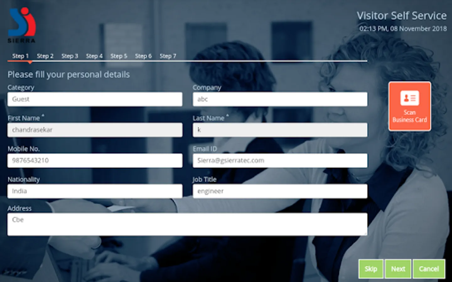 • The Visitor Name, Company Name, Address, Email ID, Phone number etc. can be entered either manually or by scanning their business card or using NFC Android beam. The mobile number of the visitor can be validated by using mobile OTP (One Time Password)