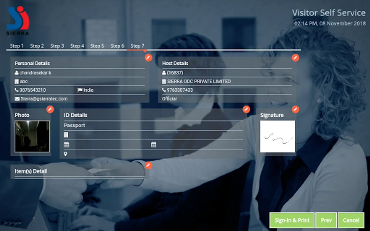 • The visitor can also take a selfie using the kiosk camera to record their face and also sign using the signature pad displayed in the kiosk
