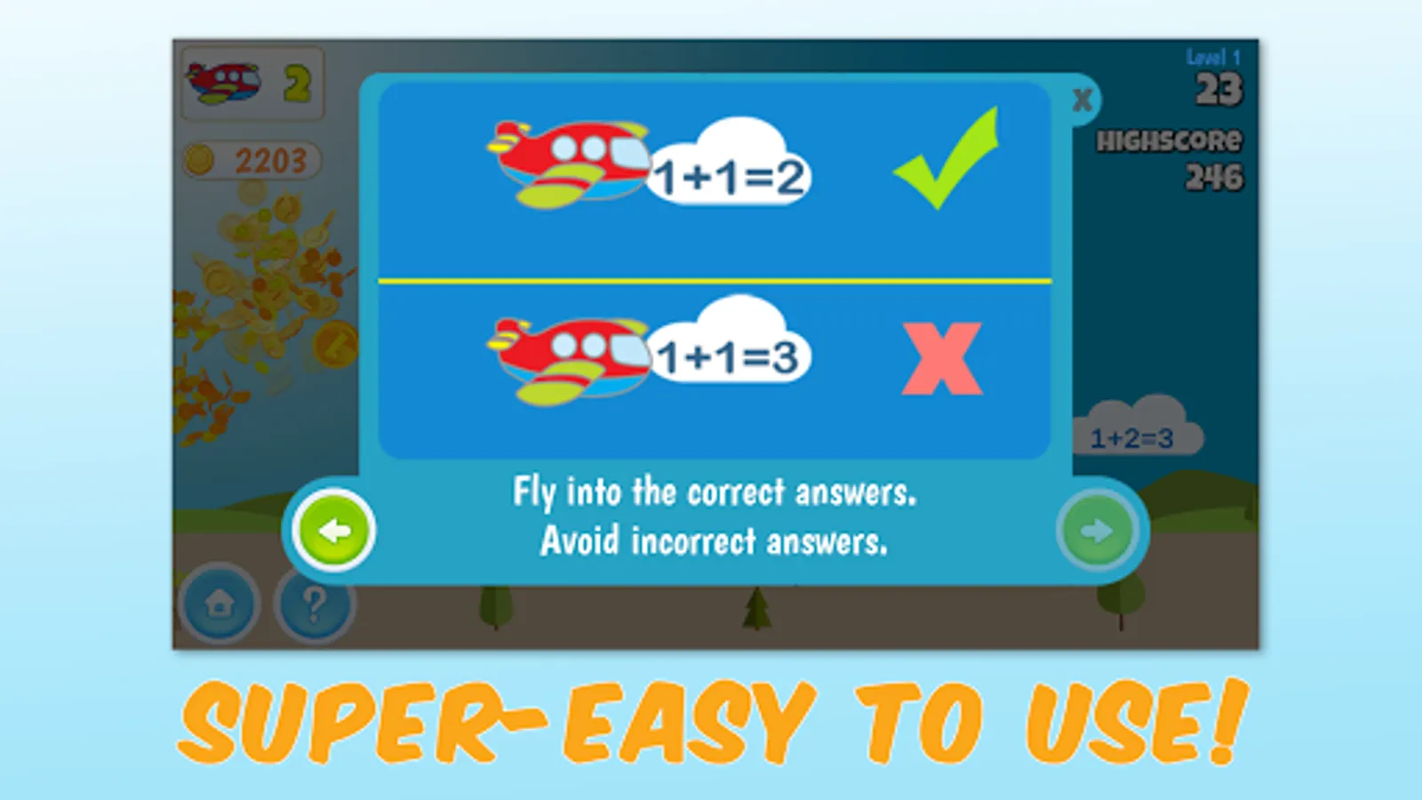 The first level is provided mainly to introduce the user to playing the game. There are very few incorrect formulas, so your main goal is to keep the airplane flying and collect some coins along the way. The levels get progressively more difficult to play. Good luck acing level 9!