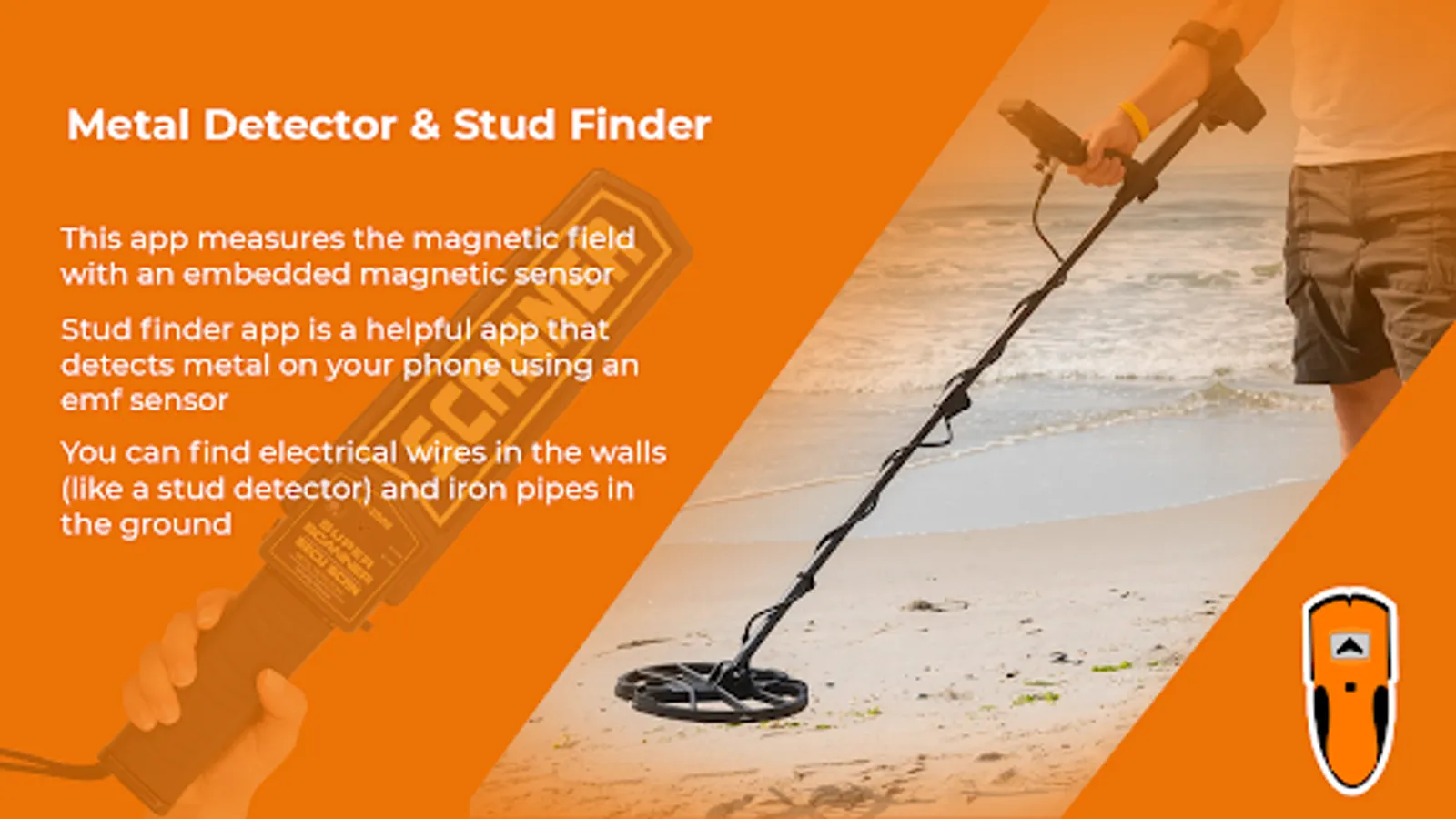 Metal detector and stud finder is an android application for measuring the presence of nearby metals. Every metallic object creates a magnetic field, and the metal finder application finds them with a magnetic sensor and starts a beep sound.