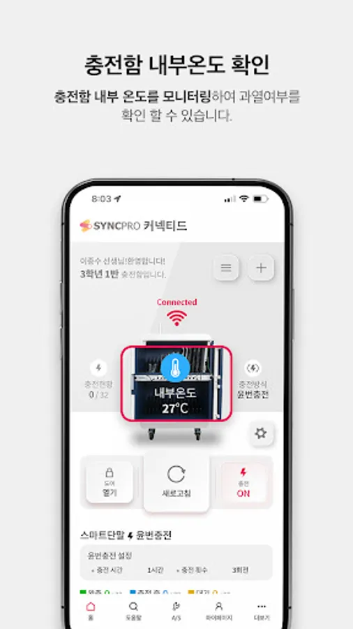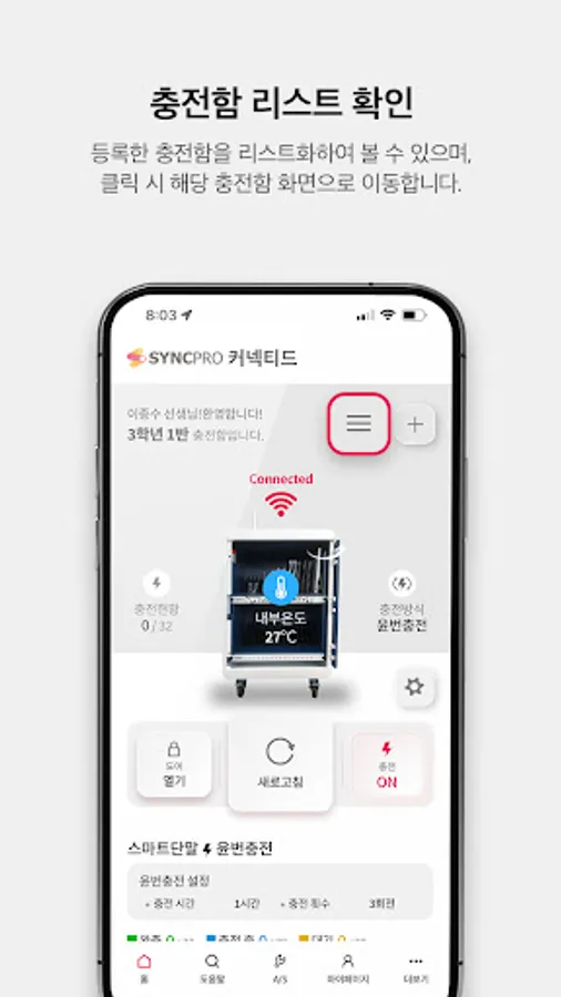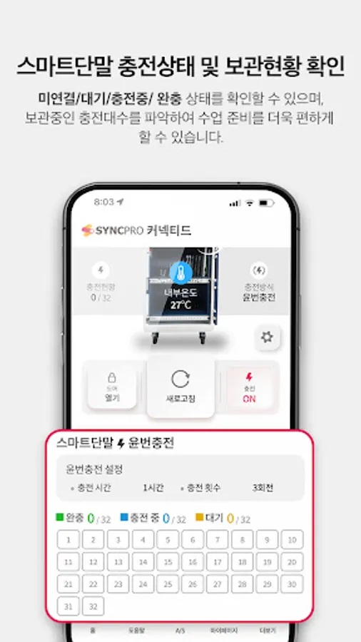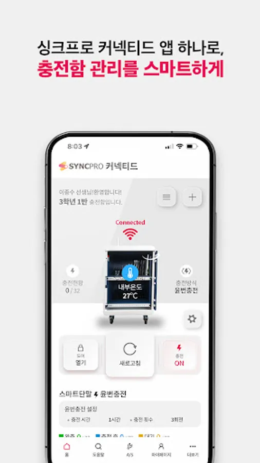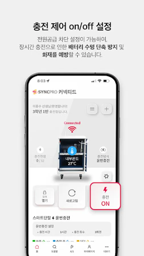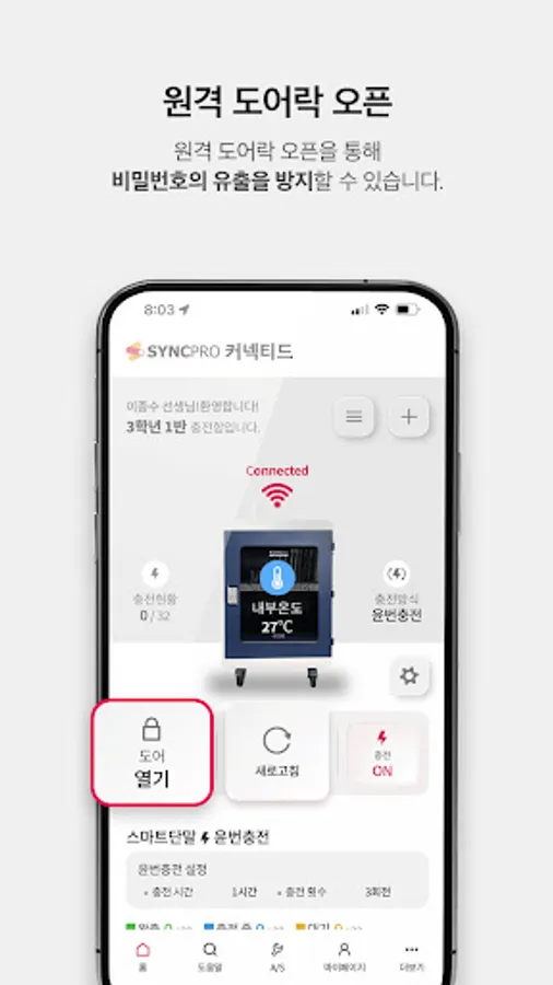 SyncPro, the only IoT charging storage box in Korea, is remotely monitored and controlled through Wi-Fi wireless communication.
