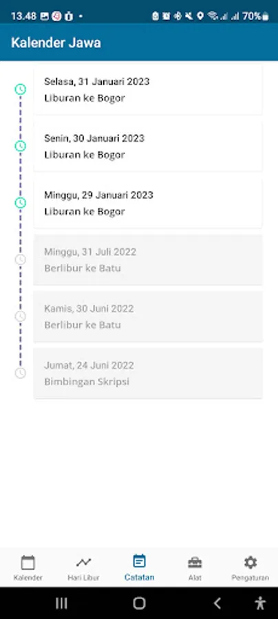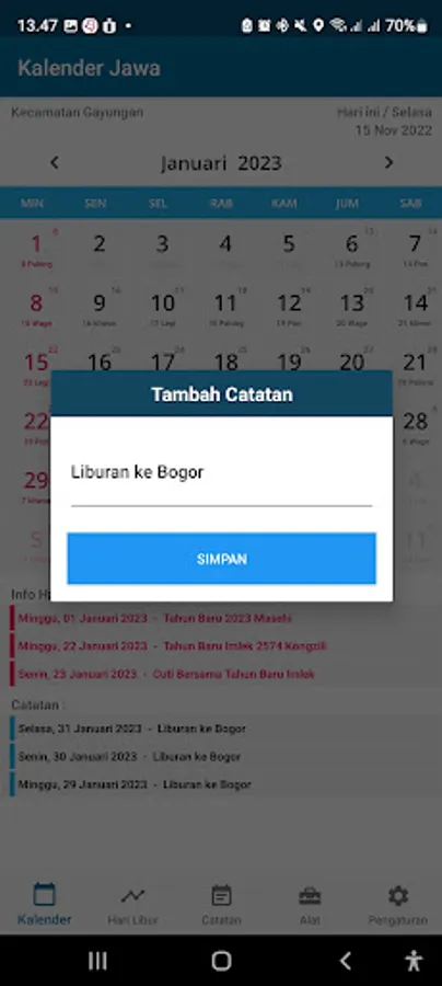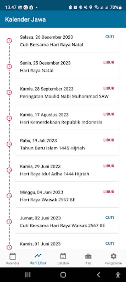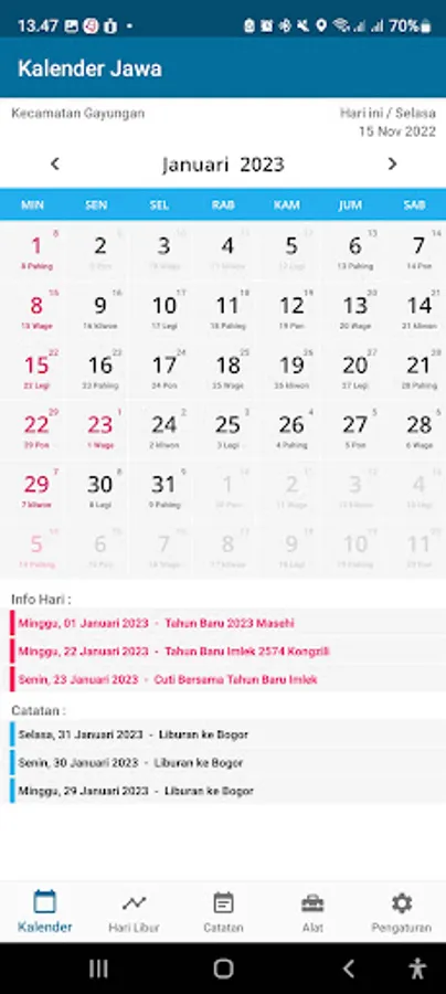This Calendar application is a complete Javanese calendar application with a Hijri calendar and a Christian calendar and displays the latest 2023 Indonesian national holidays.