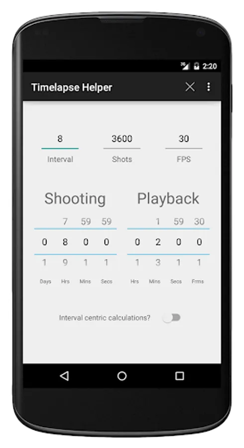 You can also set the calculator to interval-centric mode, where the interval between photos changes in priority to the other fields. That way you can scroll the shooting time or playback time and see how that changes the interval between photos.