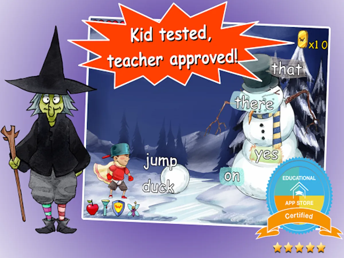 All sight words have been stolen by the forest witch. Your kid is put in the role of a sight word superhero that needs to save sight words and collect them, which awakens the imagination and the desire to learn.
