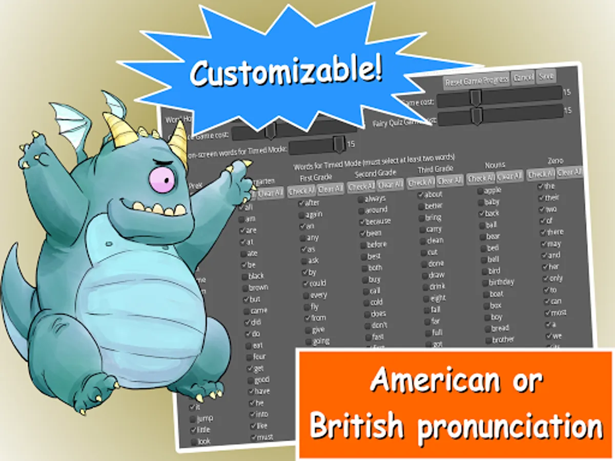Our learning sight words game is professionally narrated by two voices. Pick between an American boy's voice and a British woman's voice and help your kid learn the right pronunciation.